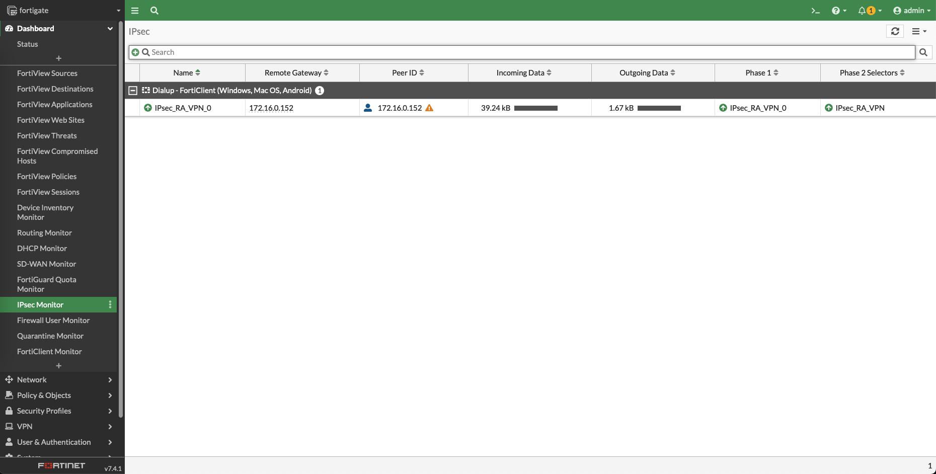 On Dashboard » IPsec Monitor, we can see the connected VPN client