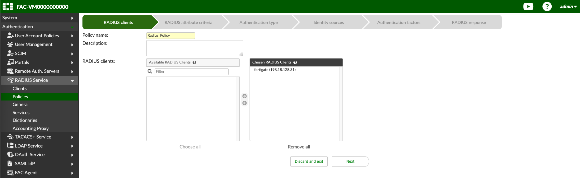 Then on RADIUS Service » Clients, add Fortigate as the client