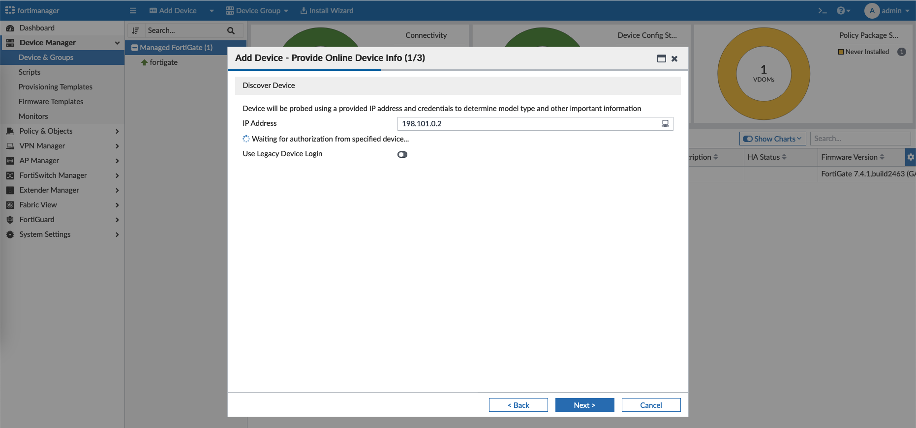 And back on Fortimanager, we can see the Fortigate being discovered as a Managed Device