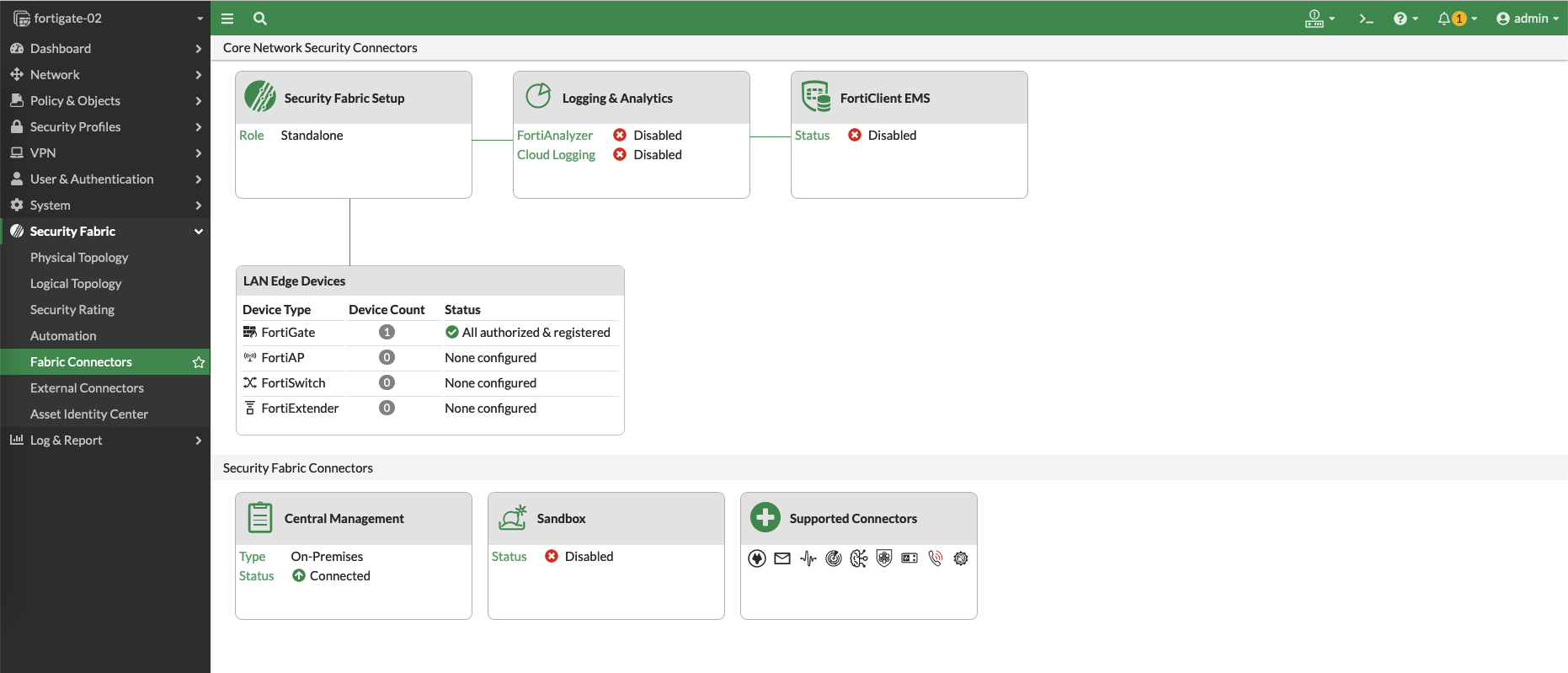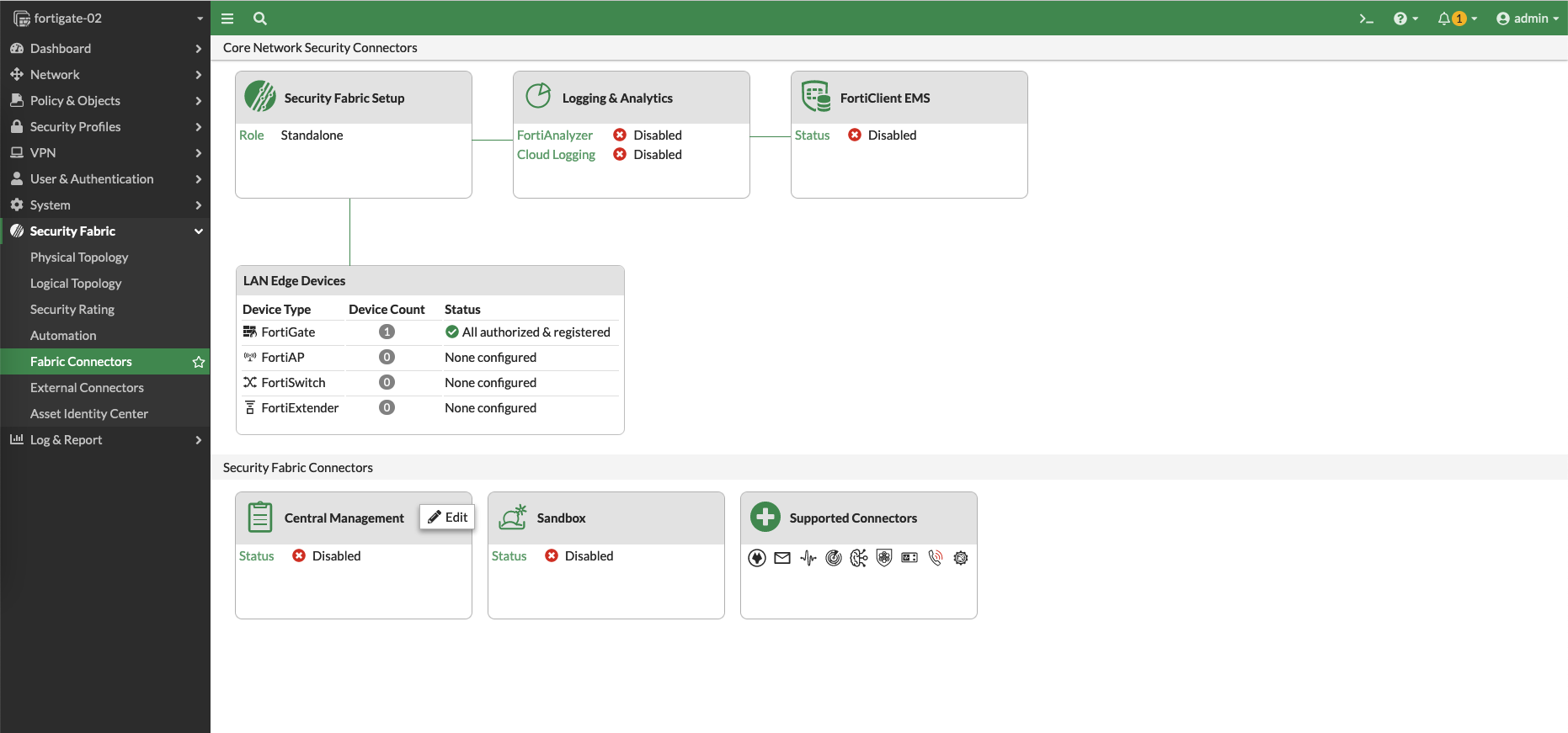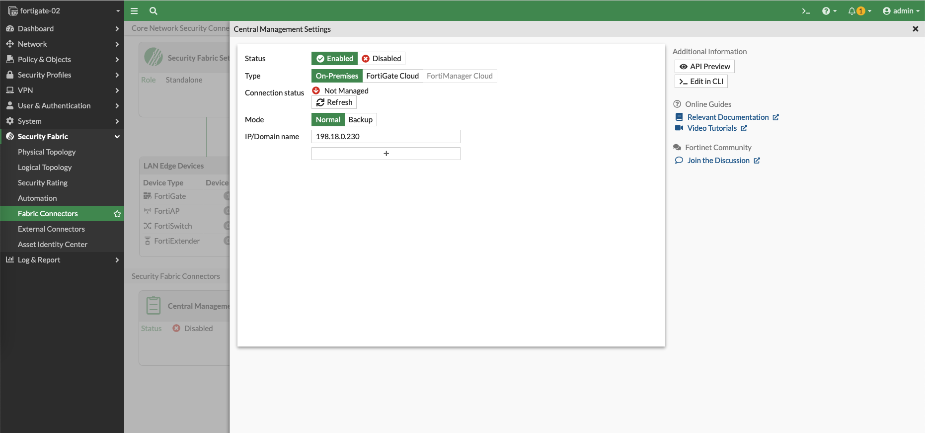 Now go to the target device, which in this case is a Fortigate Firewall, select Fabric Connectors, then edit on Central Management