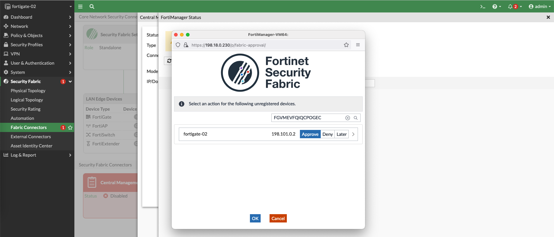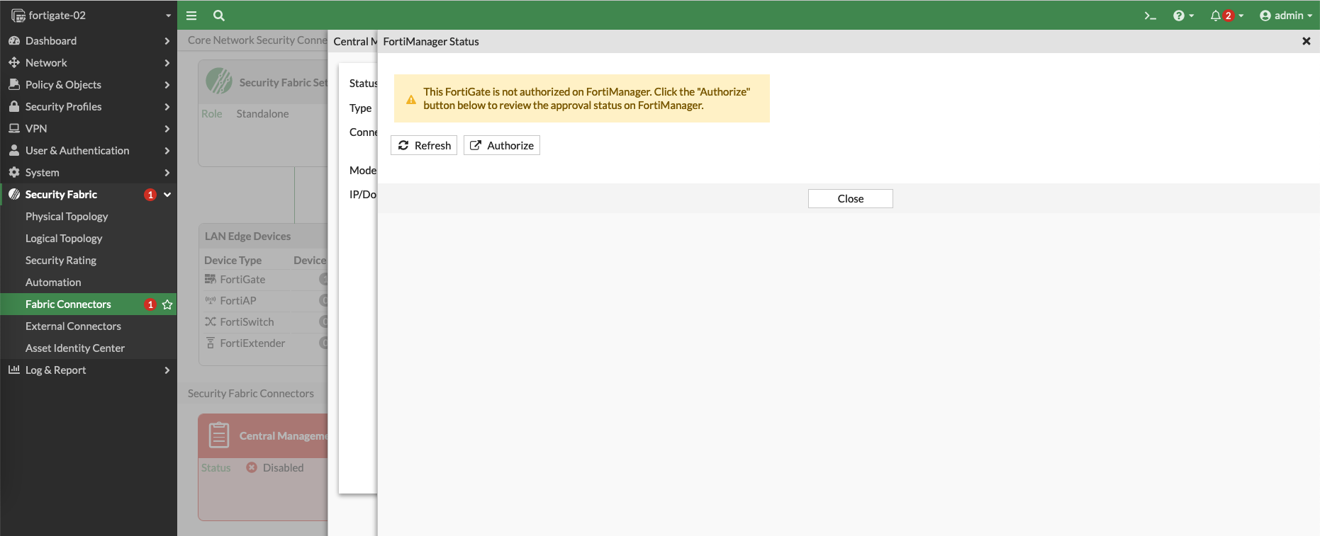 On Fortimanager Status, select Authorize
