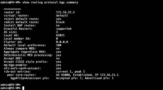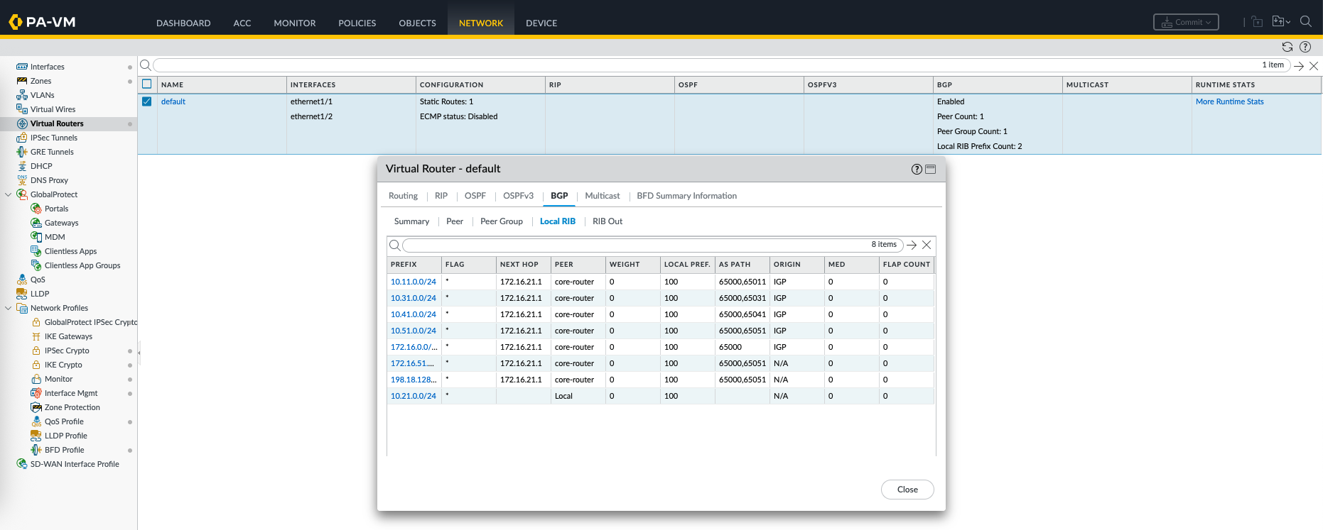 On Palo Alto, we enable BGP on the Virtual Router, here we enable the process, add AS Number, and define the BGP neighbor