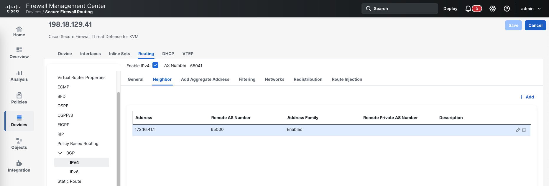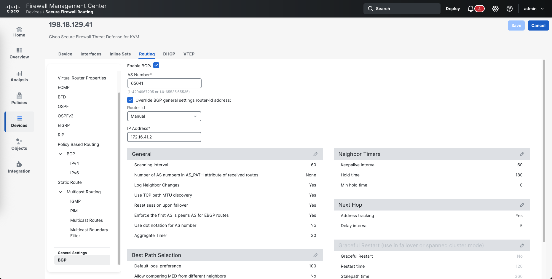 On FTD managed by FMC, first we enabel BGP and give it AS Number