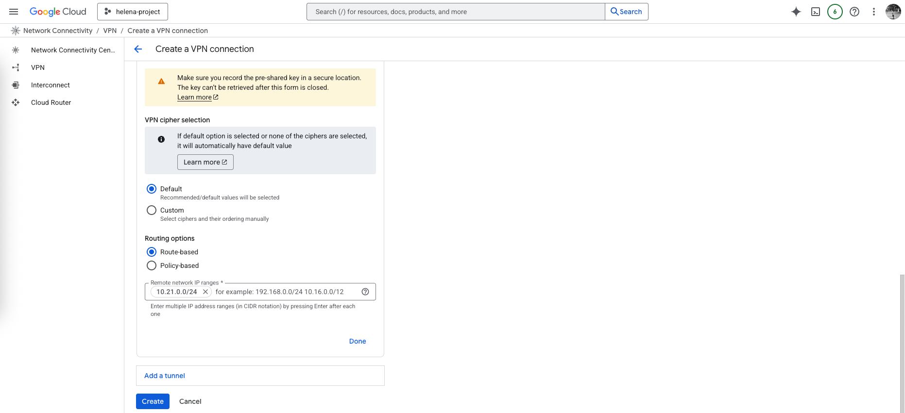 The we configure the cipher settings, we could specify the encryptions and hash settings but we’ll leave the default values for simplicity, and we select the Route based routing and enter the on-prem’s local prefix (10.21.0.0/24), then hit create.