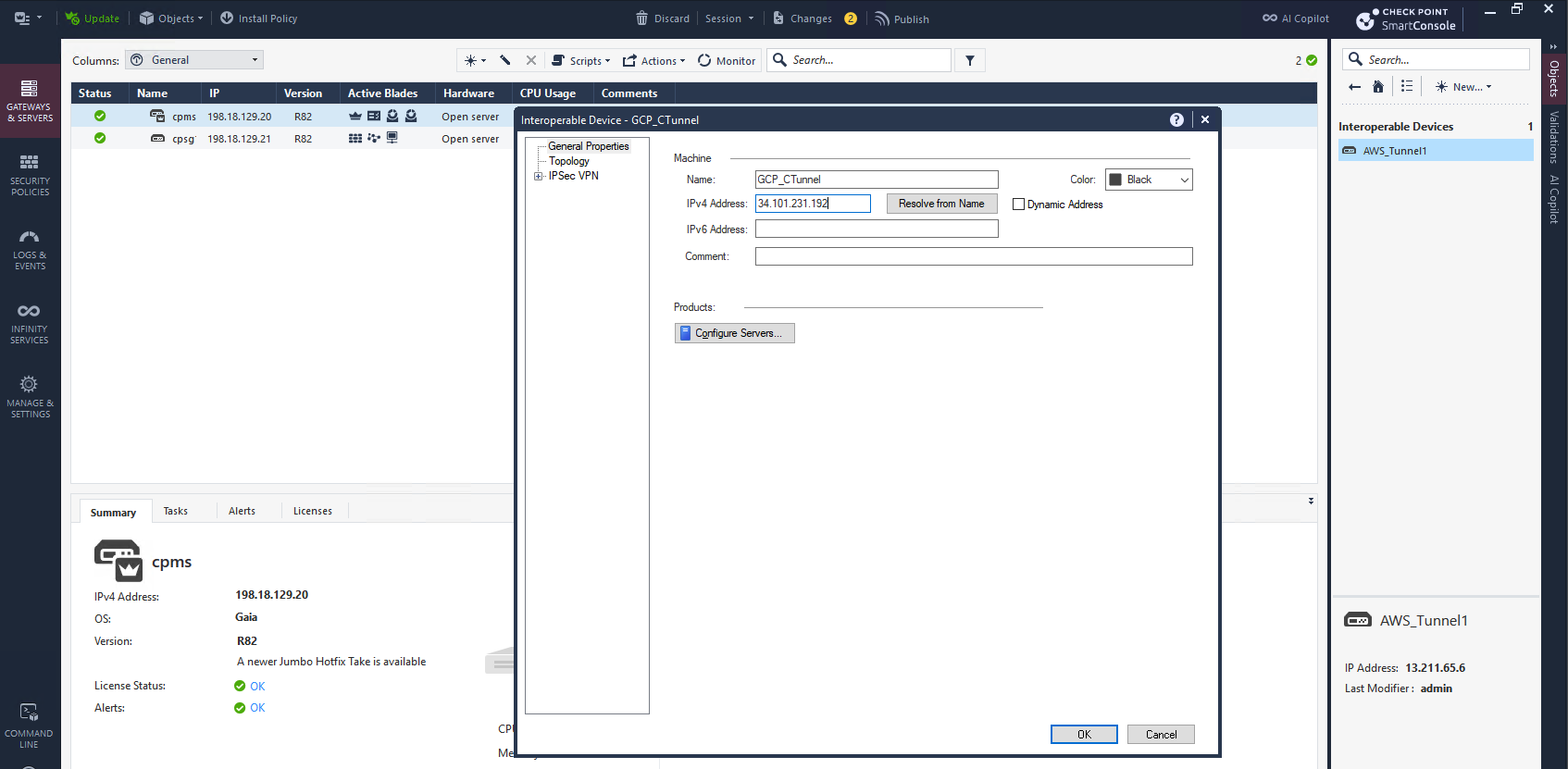 Next we create a new Interoperable Device and enter the GCP’s VPN Public IP Address that we got when creating the VPN earlier