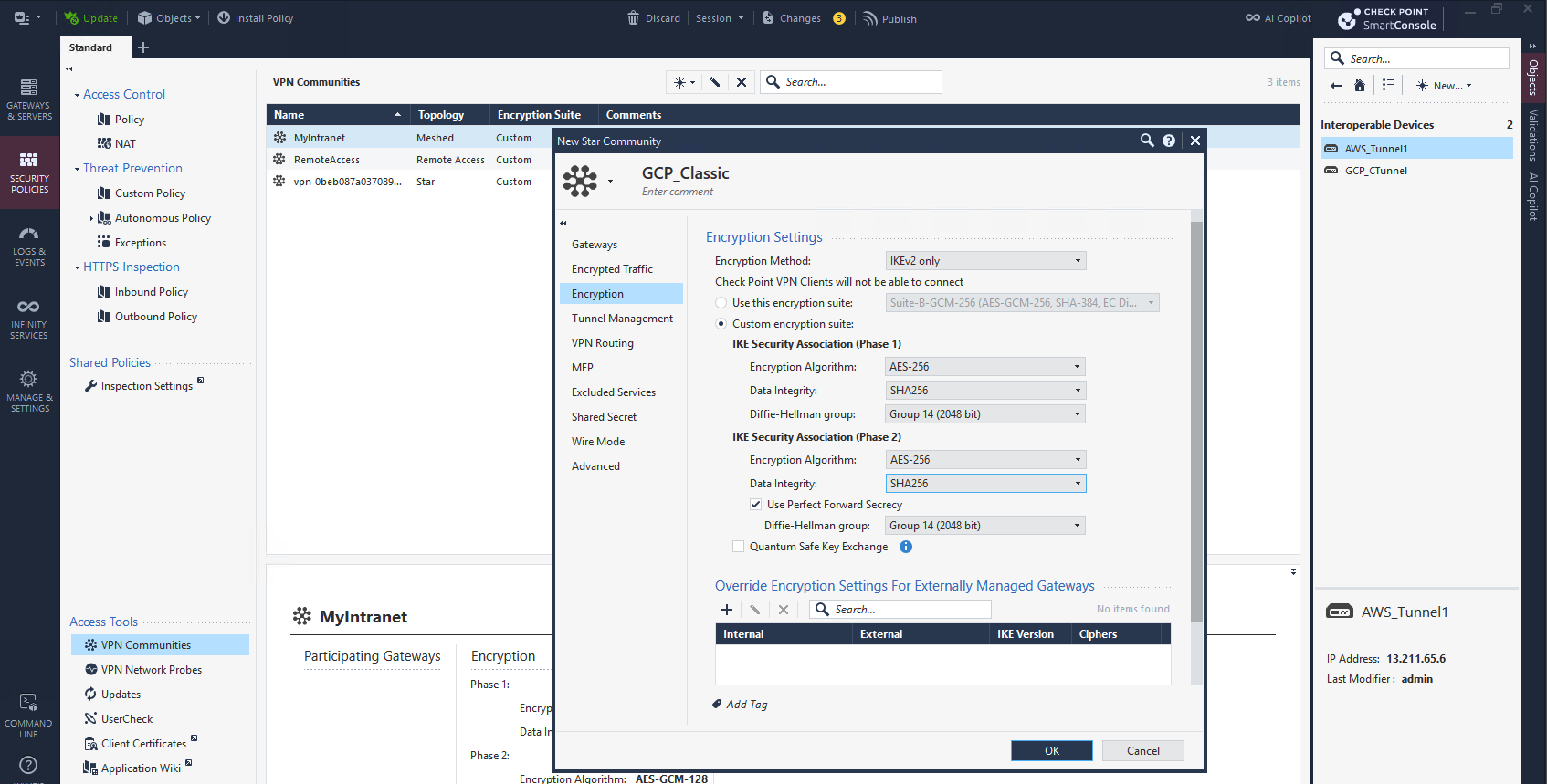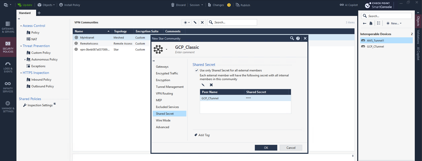 After that we create a Star VPN Community, selecting CP as Center Gateway and GCP as the Satellite Gateway