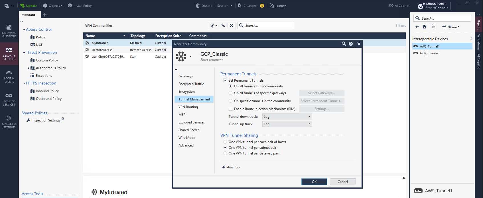 On Tunnel Management, we enable Permanent Tunnels and we select One Tunnel per Subnet