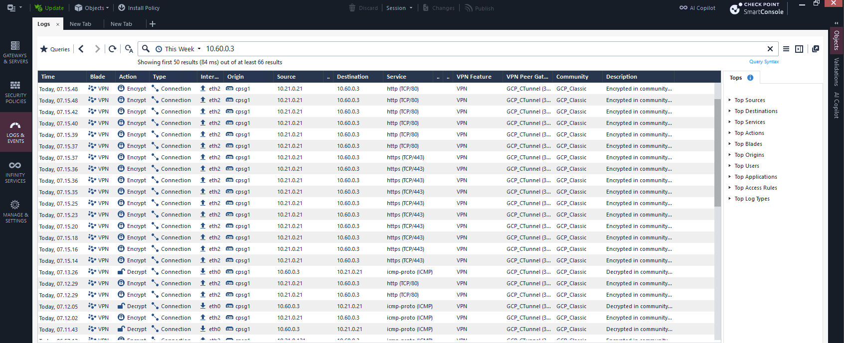 We can see the traffic going back and forth between these 2 subnets here on Check Point’s firewall logs