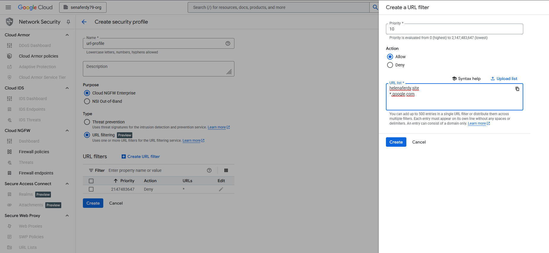 Next we create a URL Filtering Profile, here we’ll whitelist 2 URLs while blocking the rest