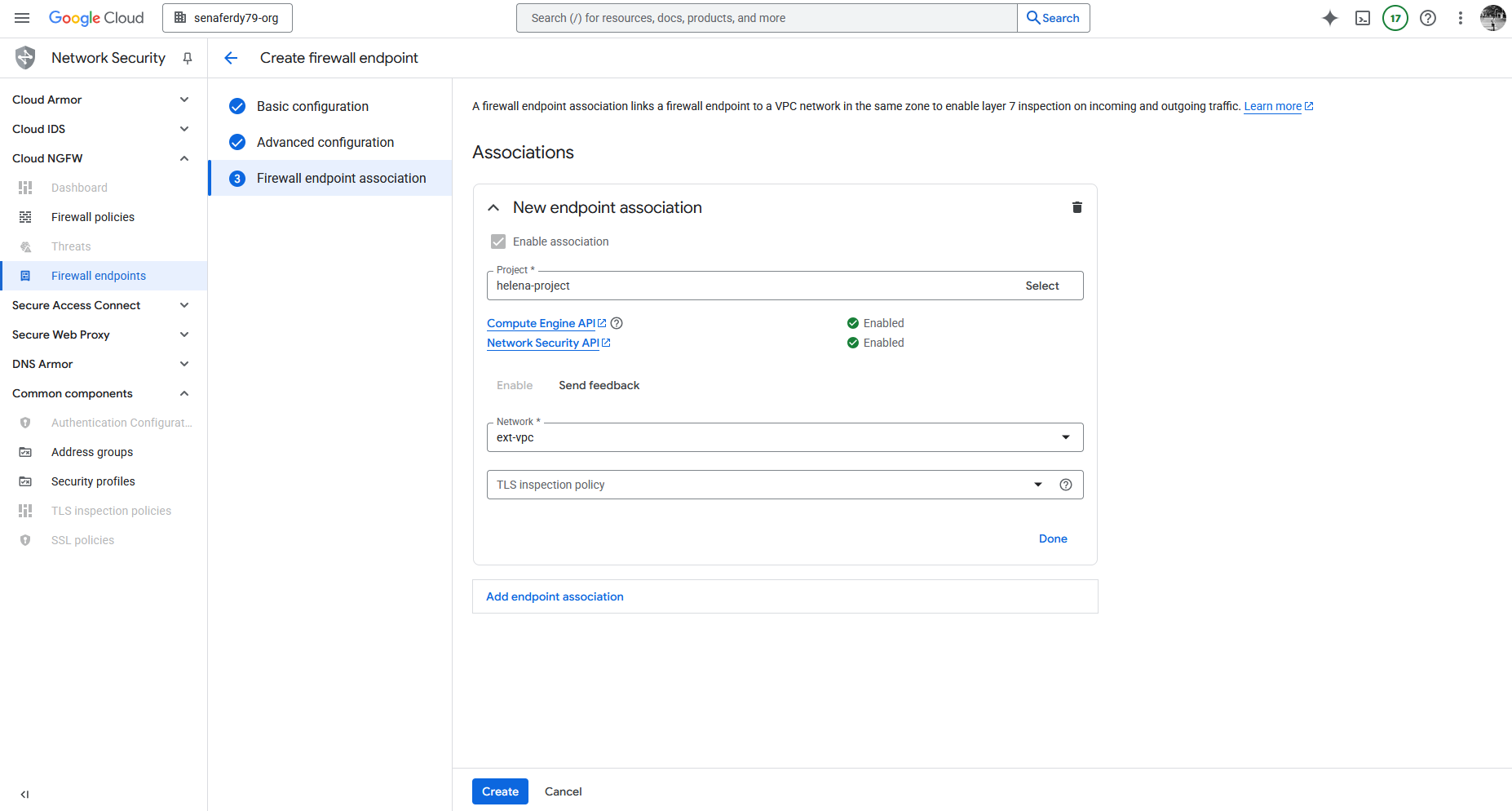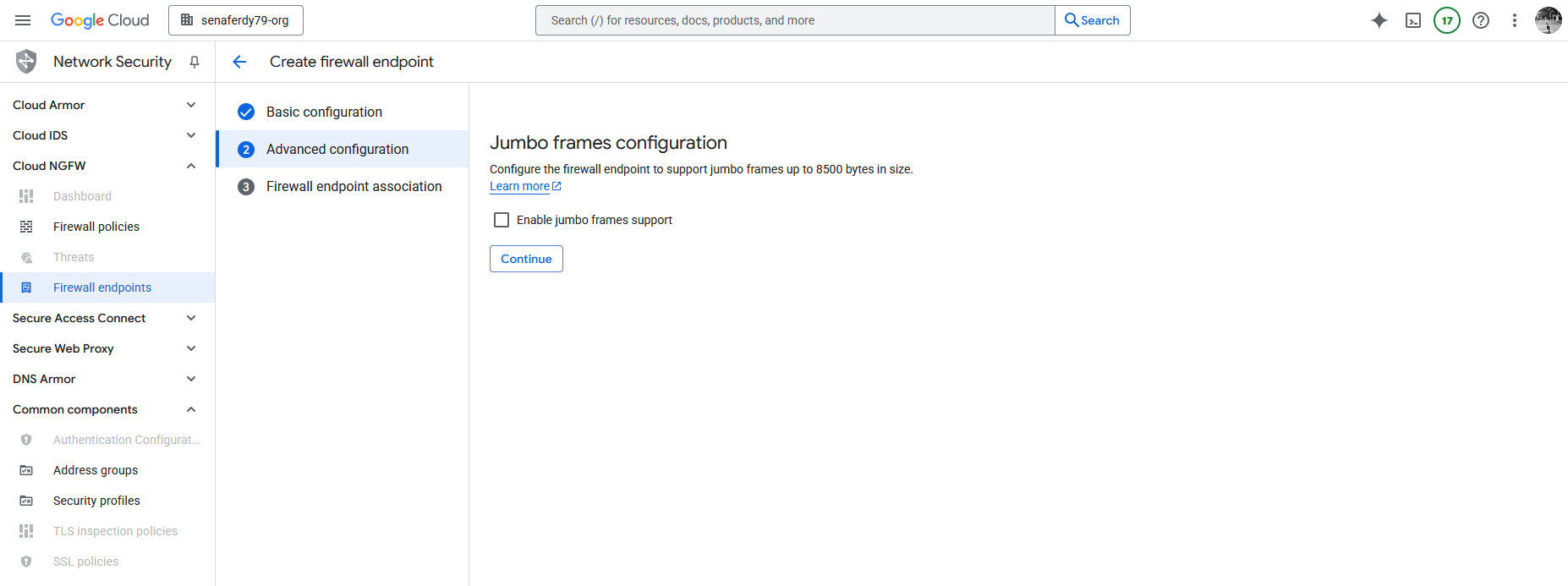 Next we can setup the Firewall Endpoint, here we select the region (FW Endpoint is regional), give it name and select the Billing Project