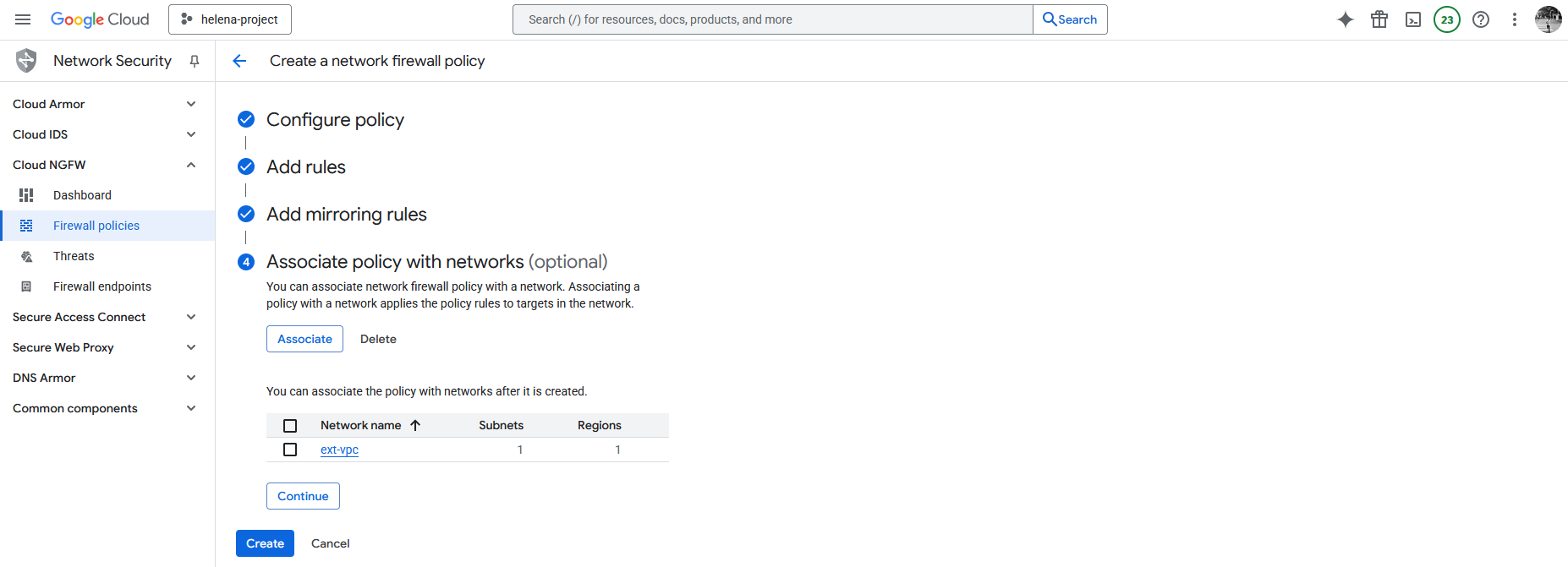 And for association, we’ll associate this FW Endpoint to the ext-vpc, the internet facing VPC, and then hit create