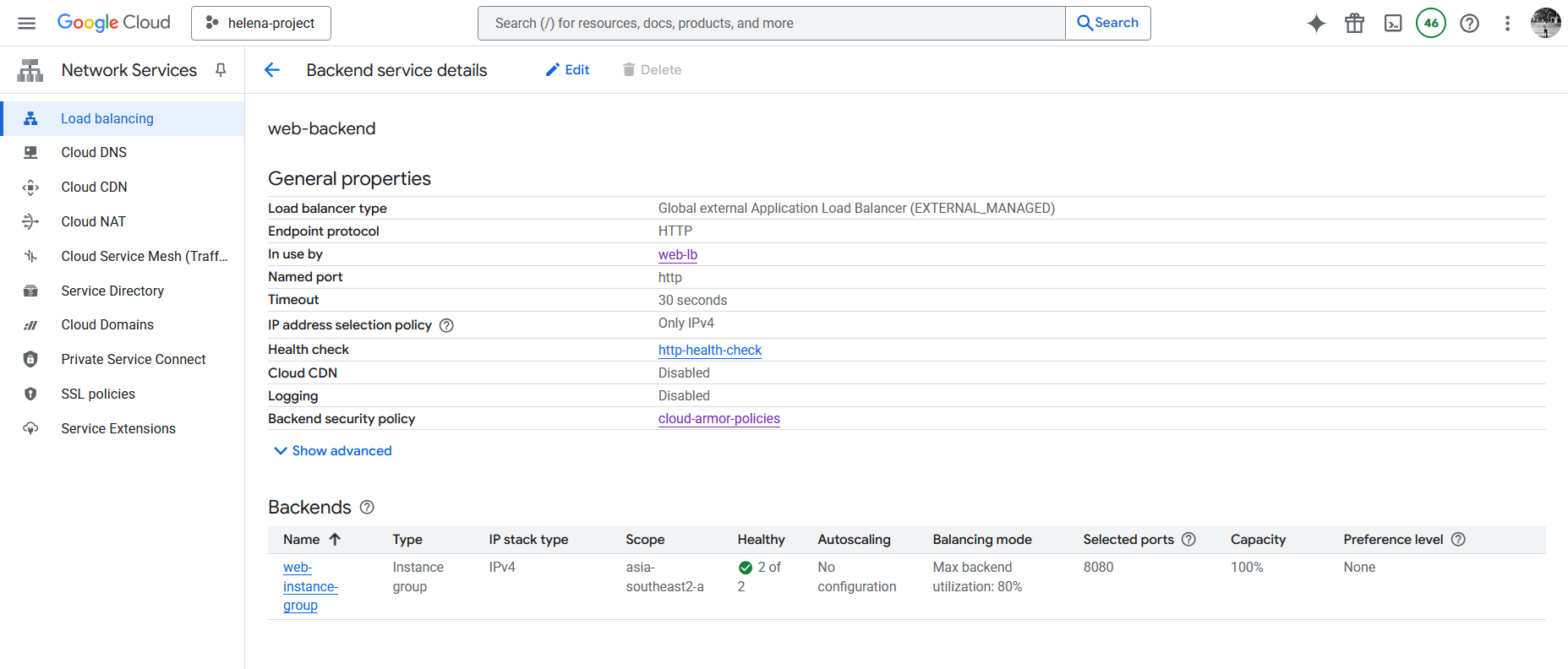 Next we configure the Backend, here we create a new Backend Service that points to the Instance Group we created earlier on port 8080. Here we also disable any Cloud Armor policy because we’ll configure it later.