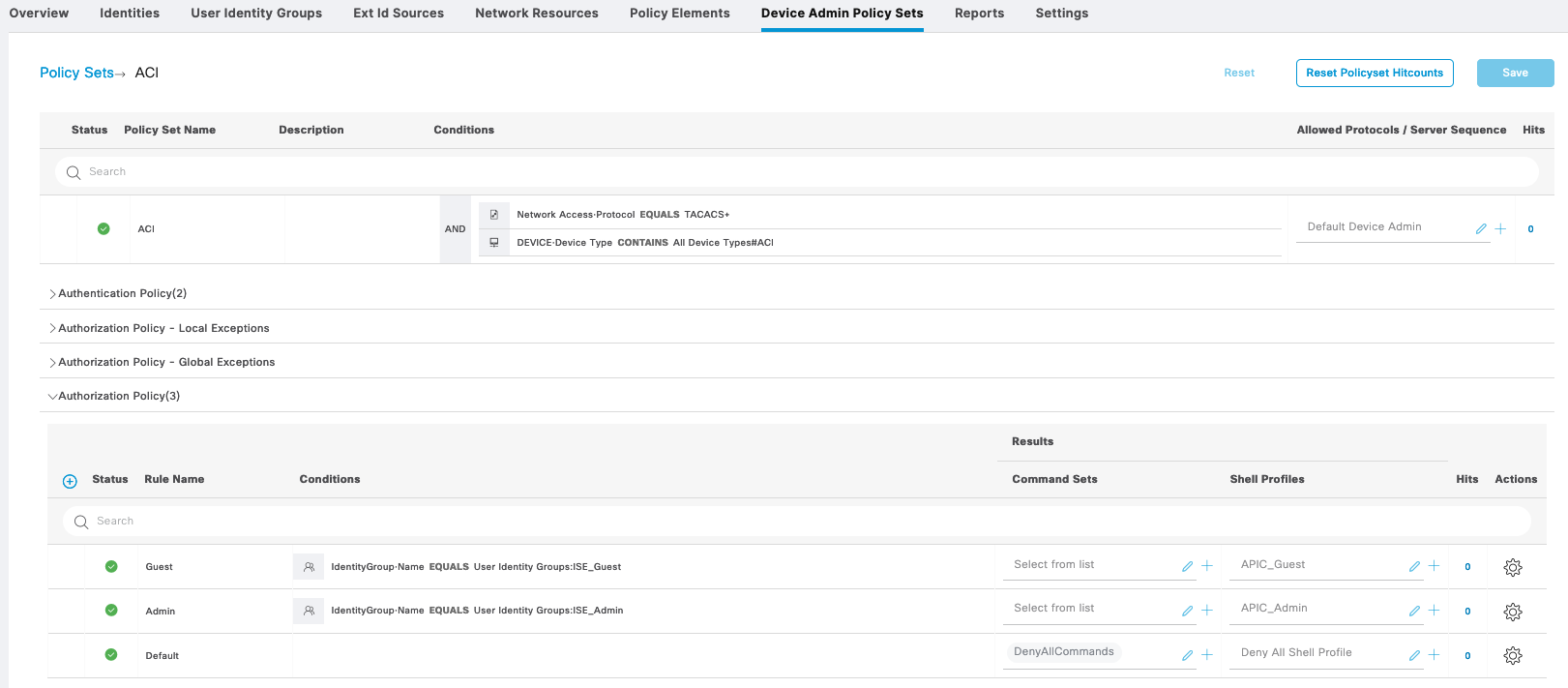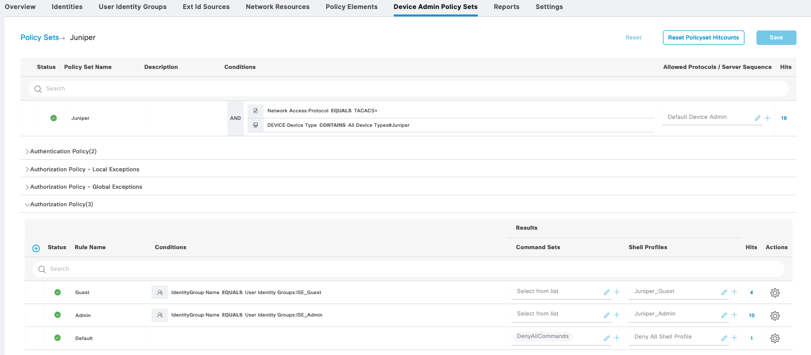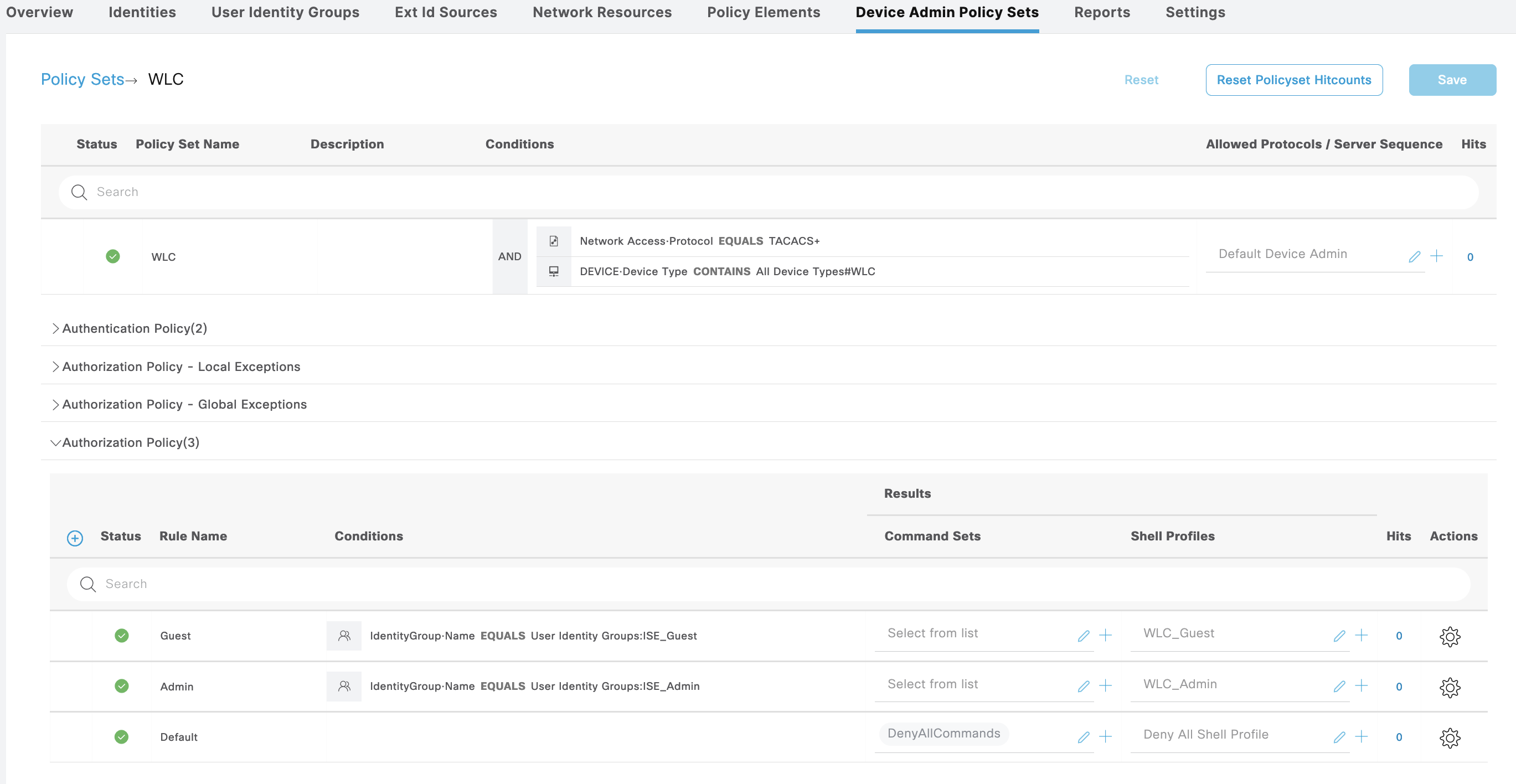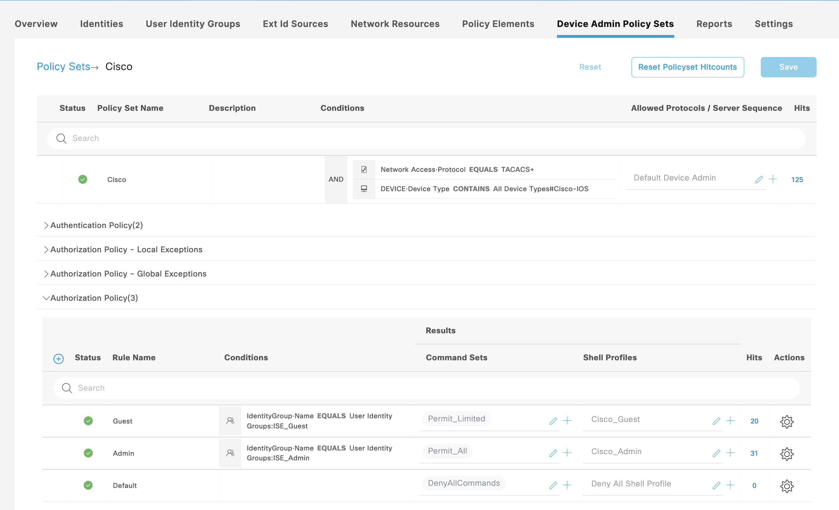 First on Work Centers » Device Administration » Device Admin Policy Set, create a policy set for Cisco IOS Devices, with 2 types of Authorization, Admin and Guest