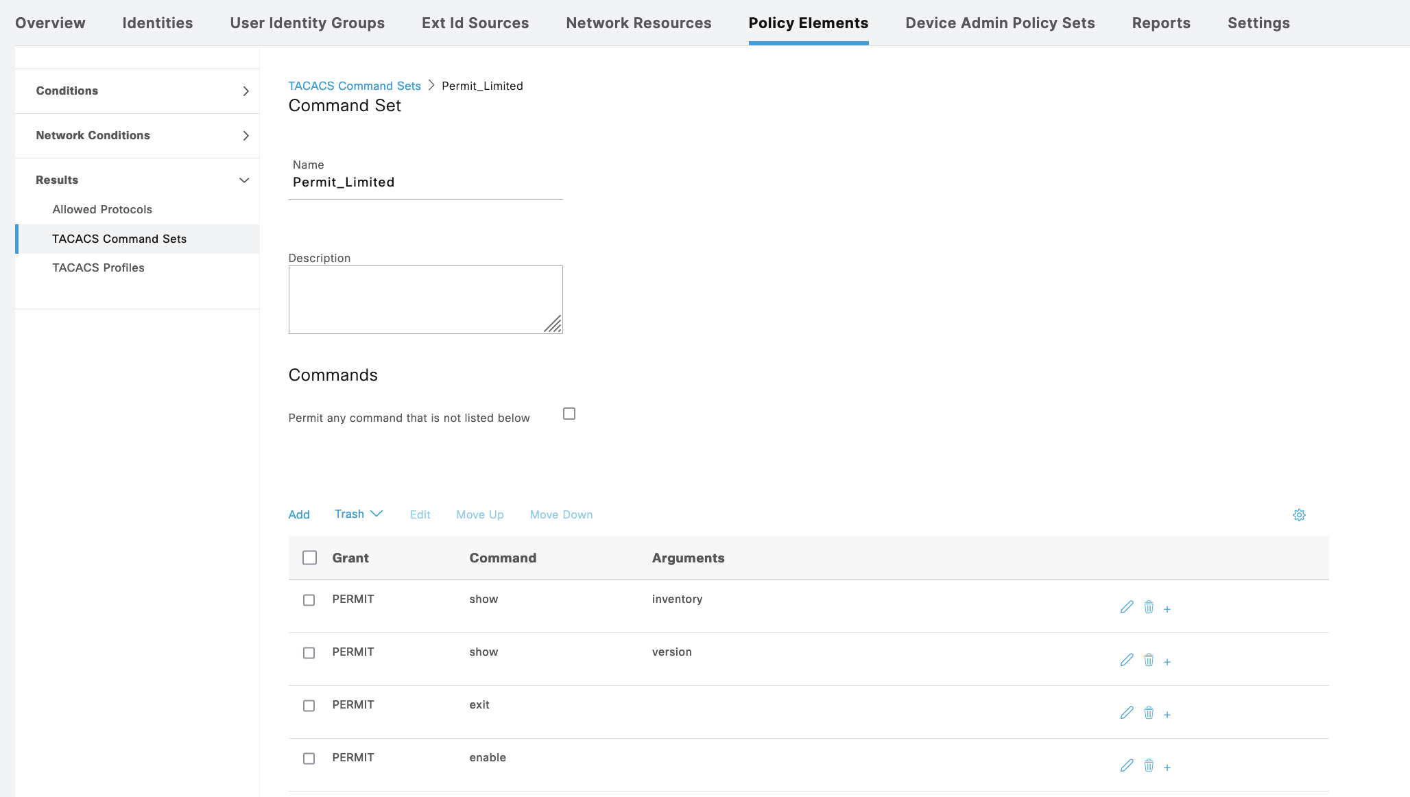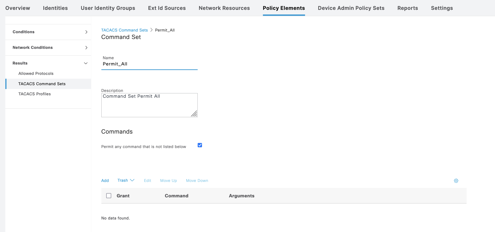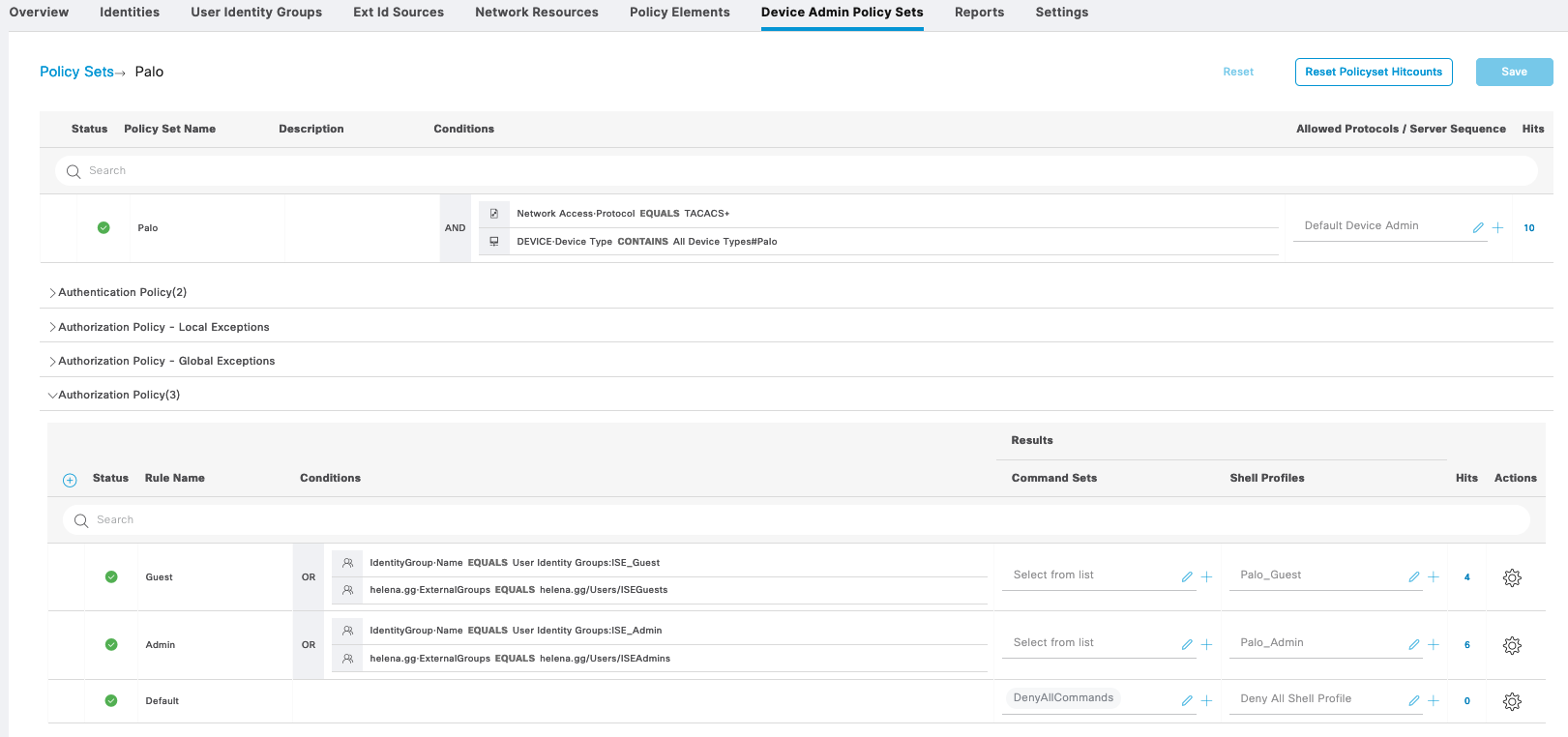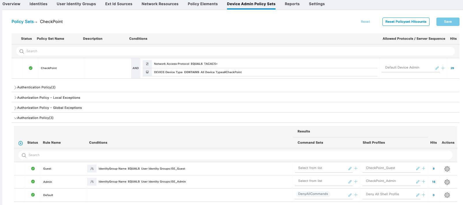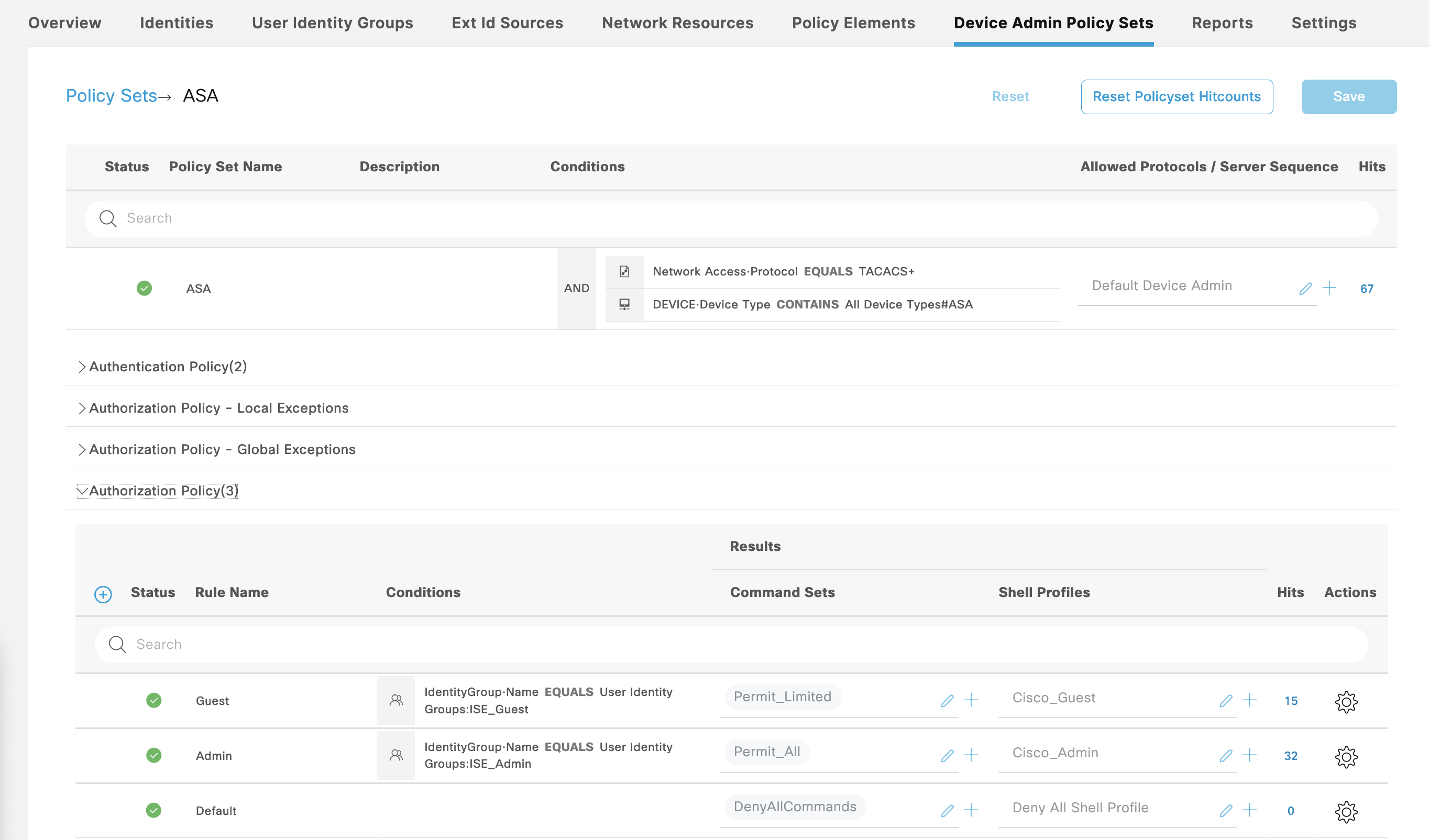 For Cisco ASA, we create a new Policy Sets containing the same Command Sets and Shell Profiles used on Cisco IOS