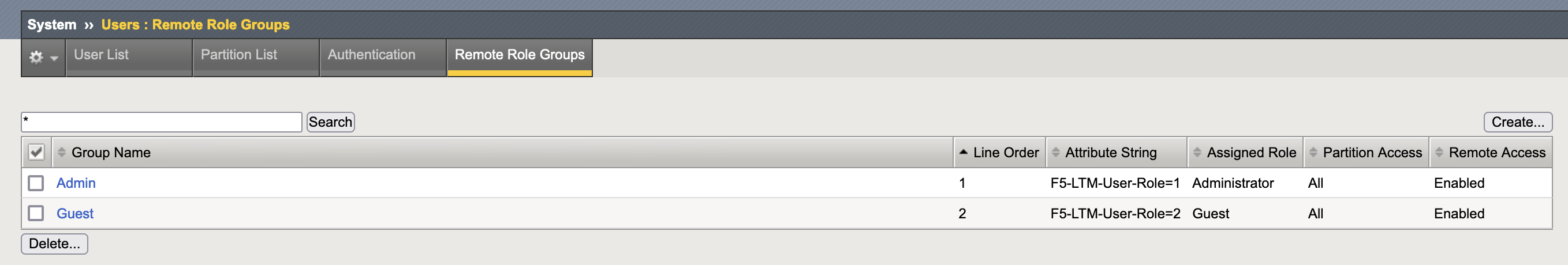 Now on the F5, on System » User » Remote Role Groups, we create 2 groups with the mapped attribute to correspond to its respective role