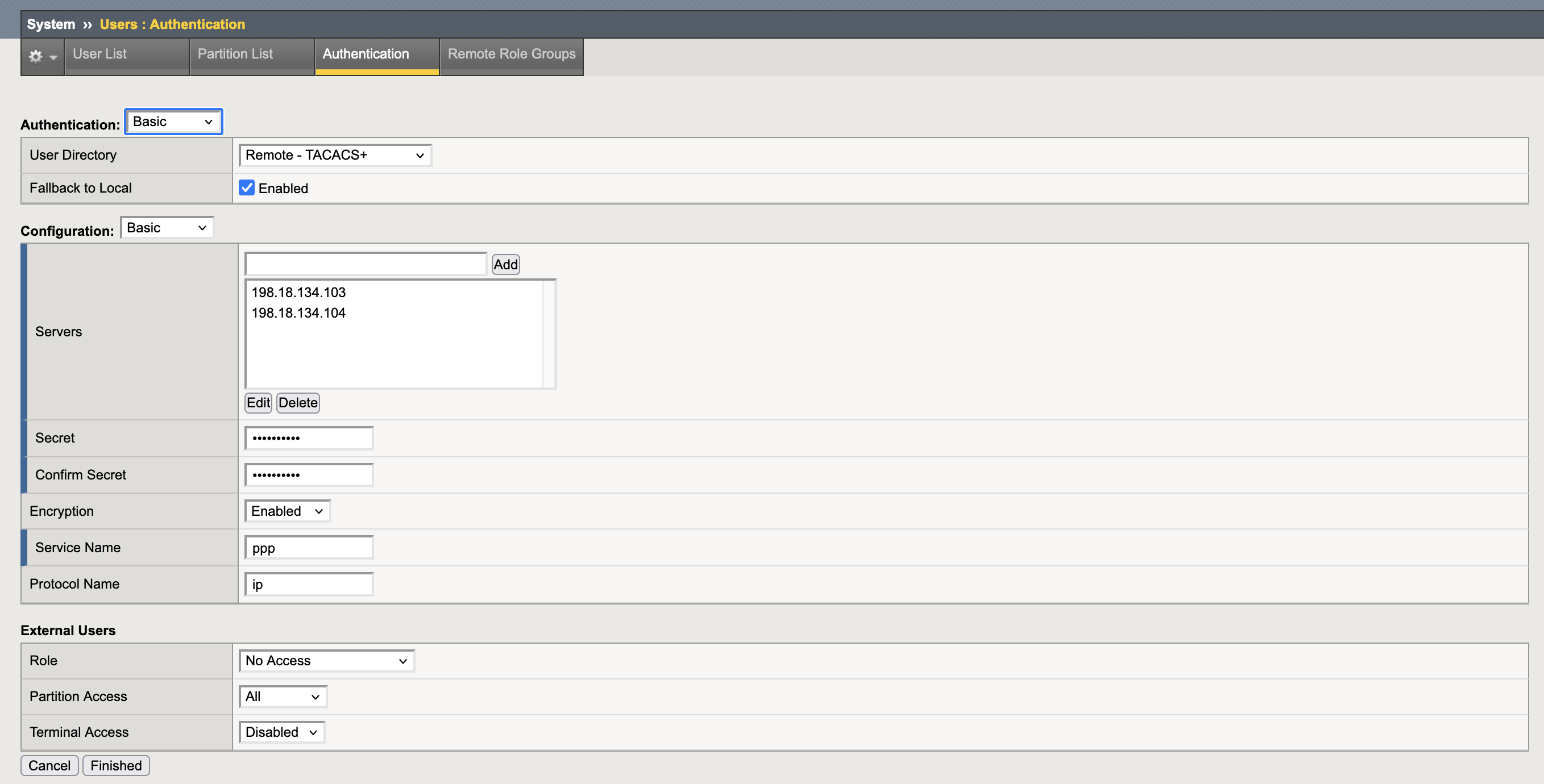 And then on Authentication, we enable TACACS+ and add the ISE Servers