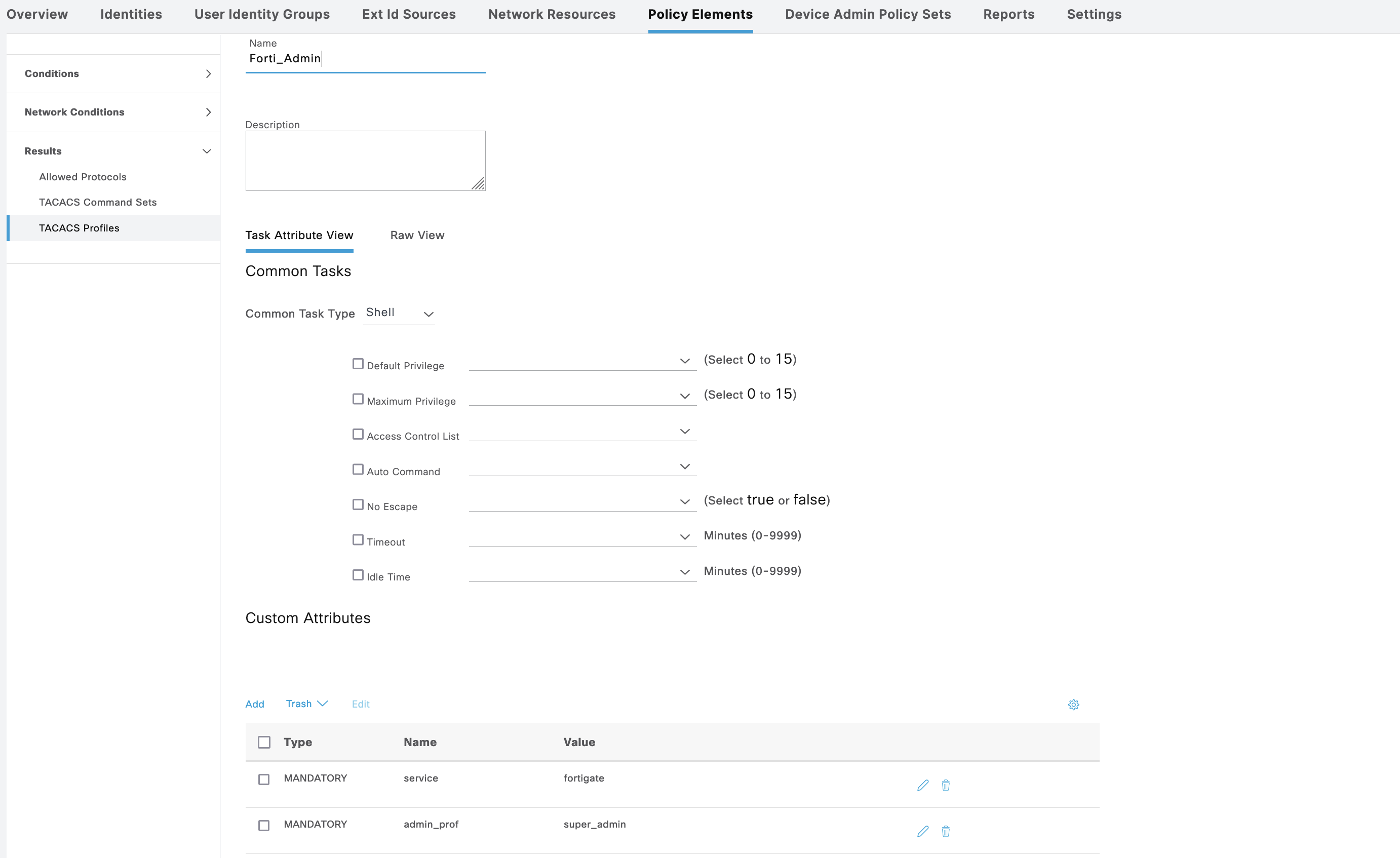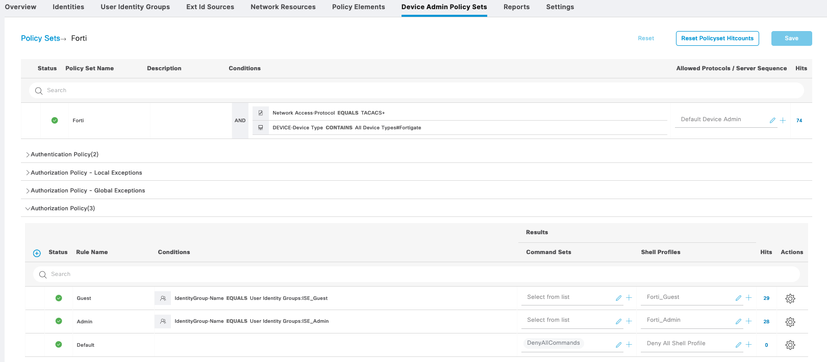 For Forti, we also create a Policy Sets with 2 Authorization Shell Profiles