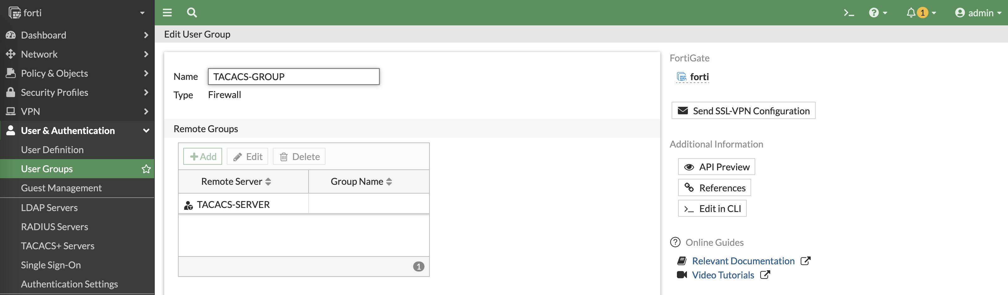 Then create a User Group with the TACACS-SERVERS as the member
