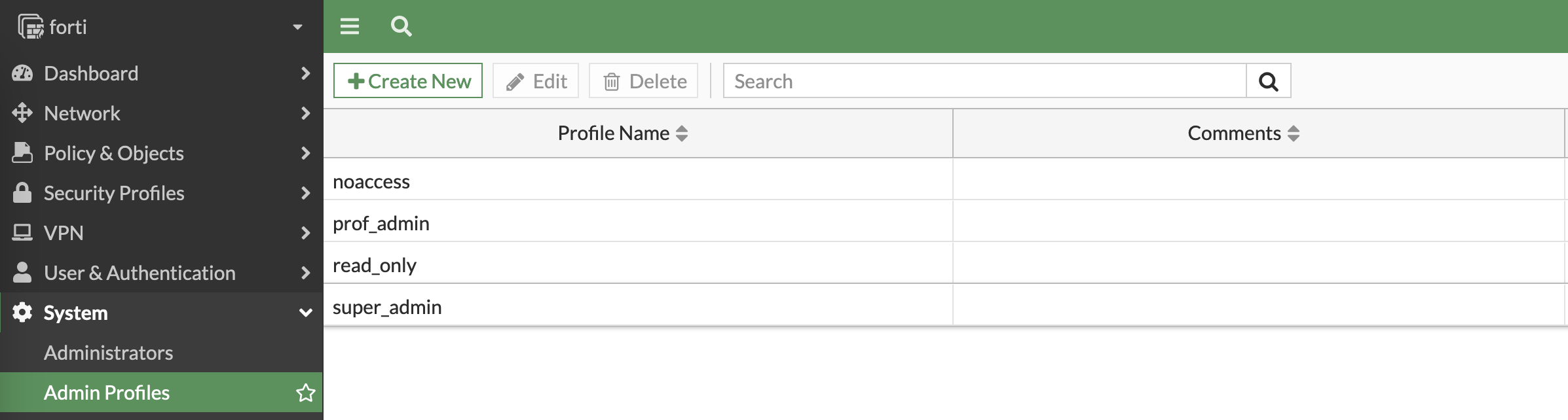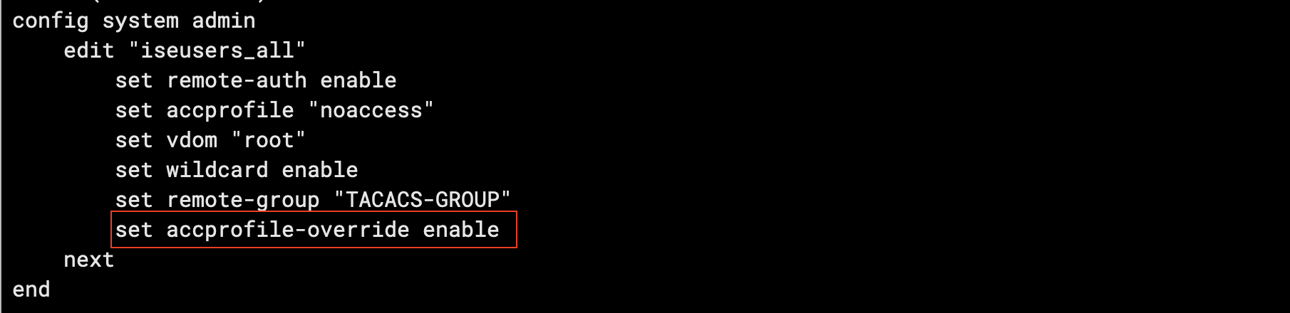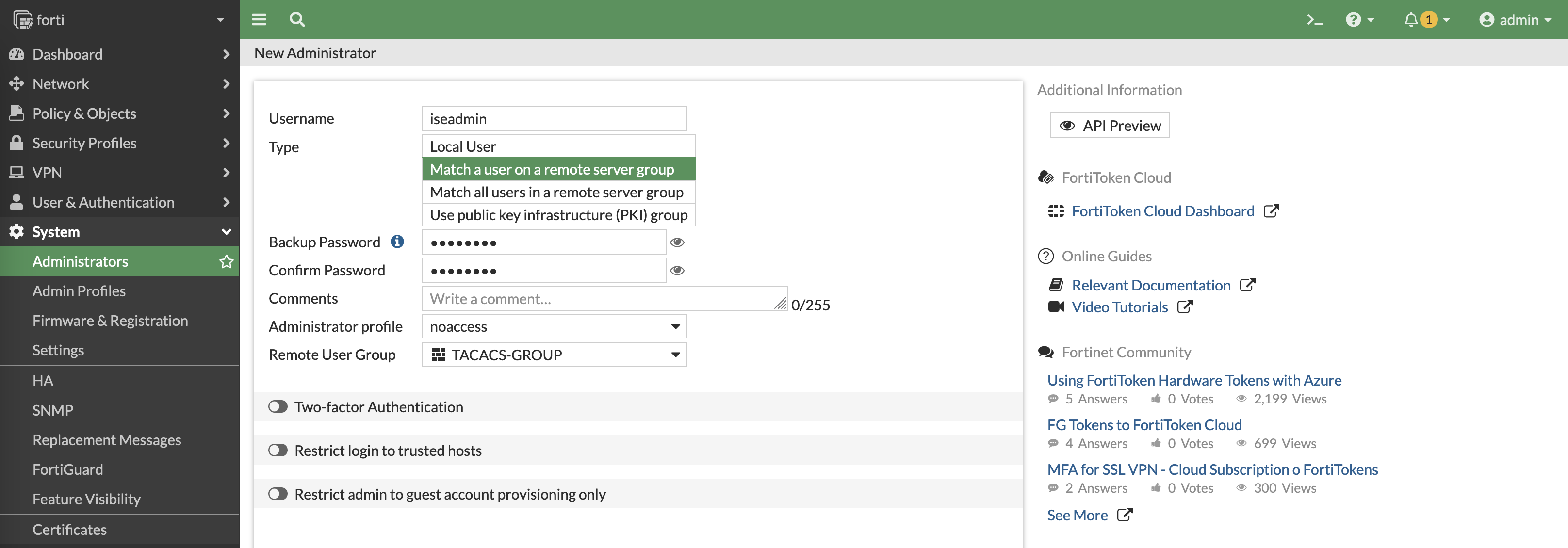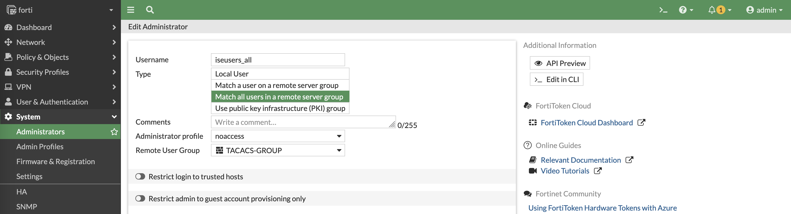 On the Fortigate, match those attributes set on ISE into Admin Profiles here, notice that we also add a new profile named “noaccess” which will be the default profile for all tacacs user until it is overriden by attribute pushed by ISE