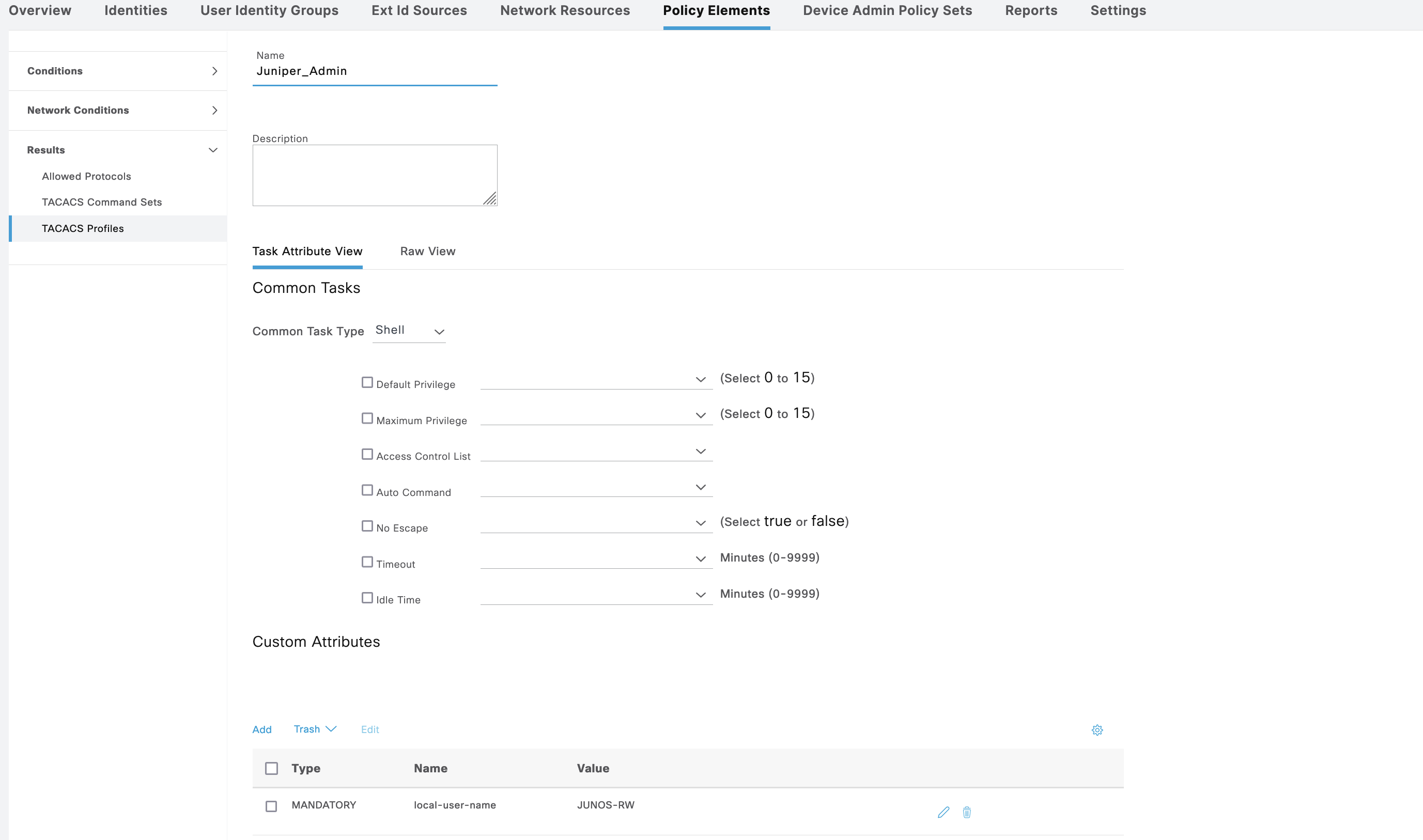 For shell profile Juniper_Admin, we add attribute “local-user-name” with value of “JUNOS-RW”