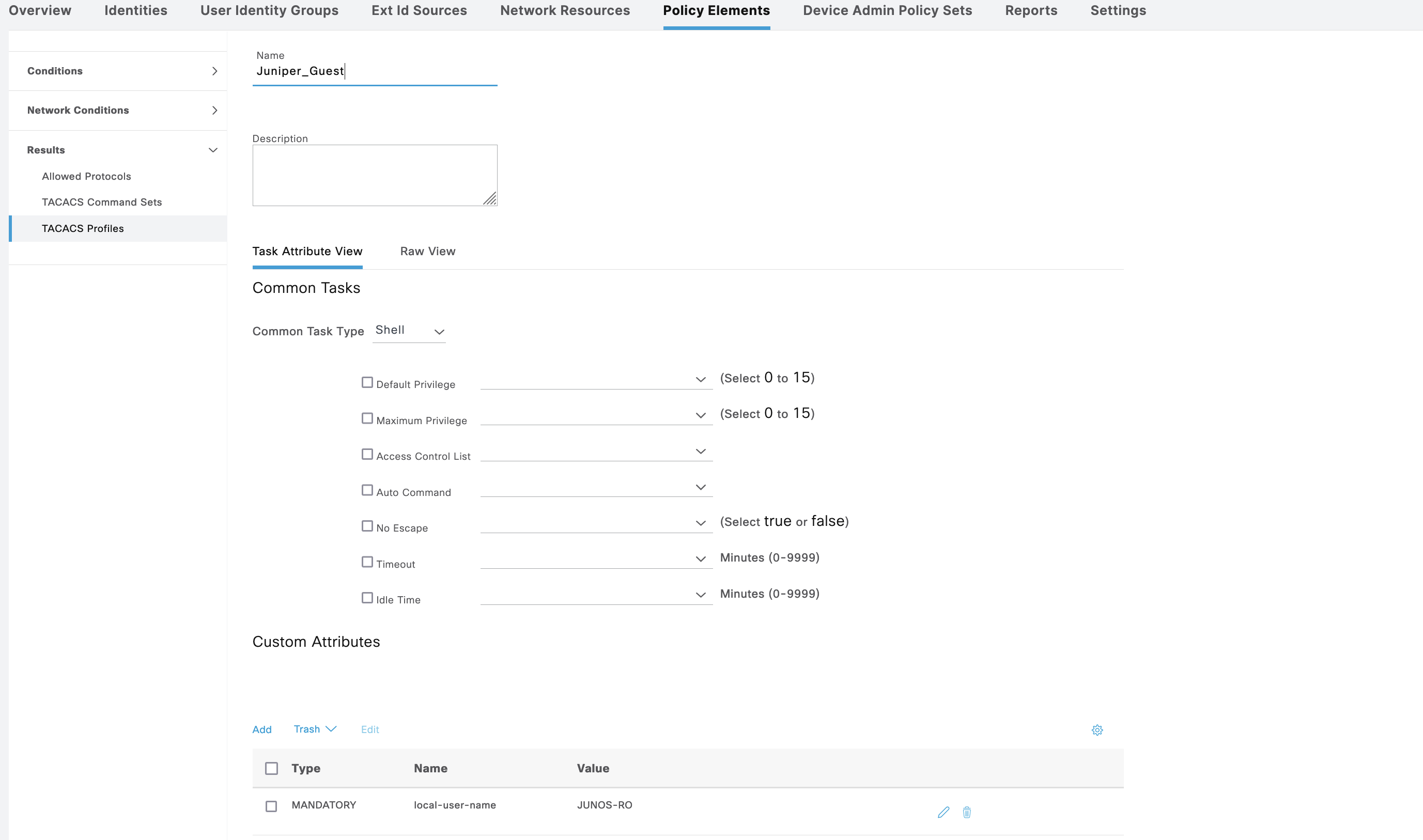 On Policy Elements » TACACS Profile, create 2 profiles for Admin and Guest