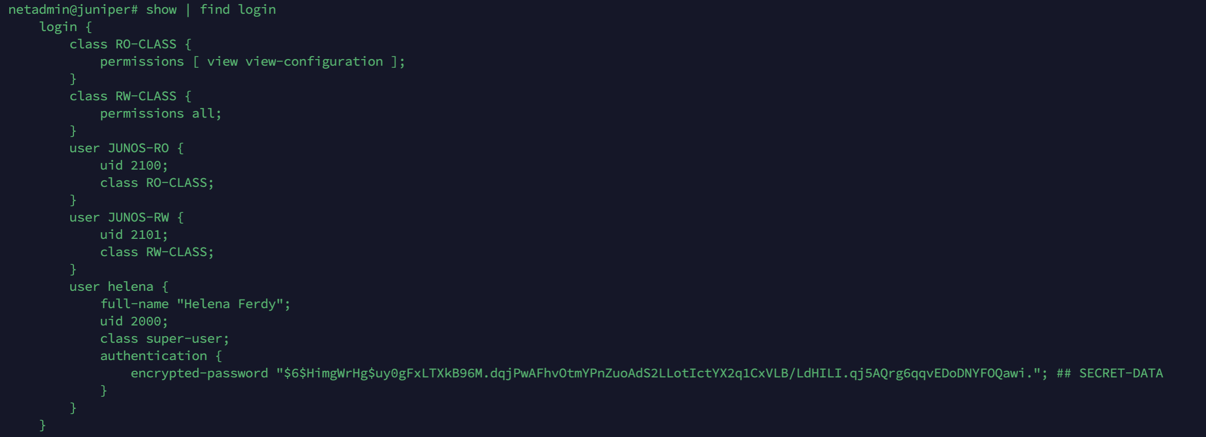 And for Juniper_Guest, the “local-user-name” has value of “JUNOS-RO”