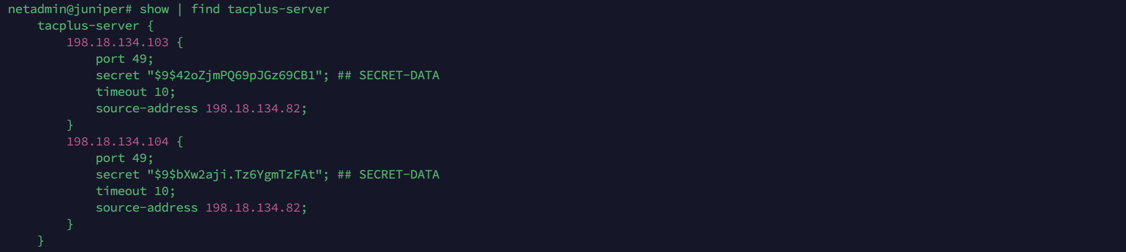set system tacplus-server 198.18.134.104 secret helena