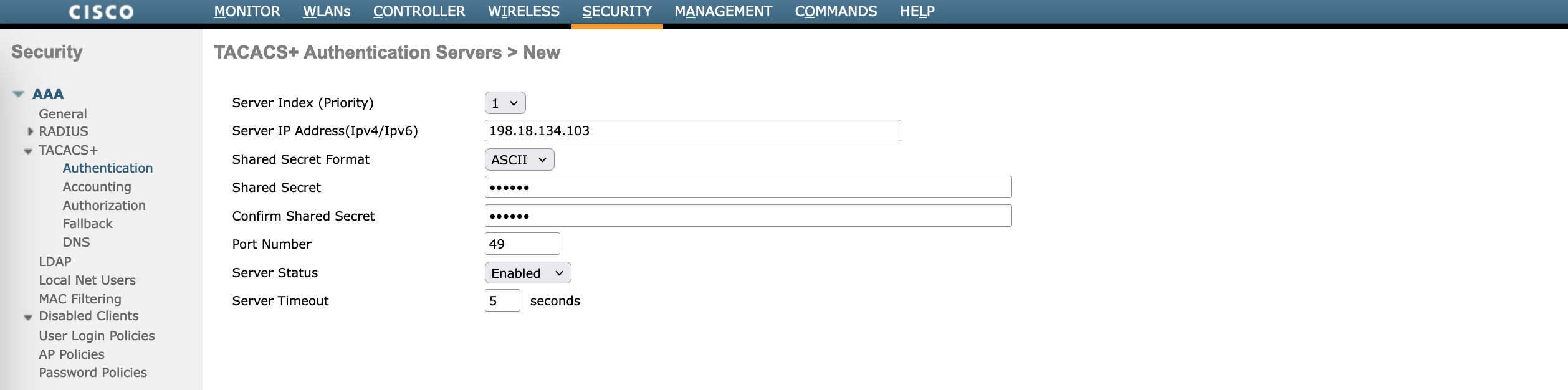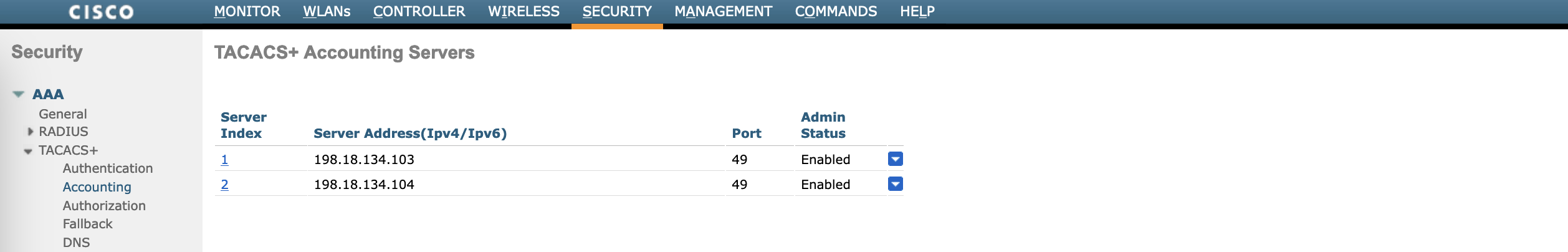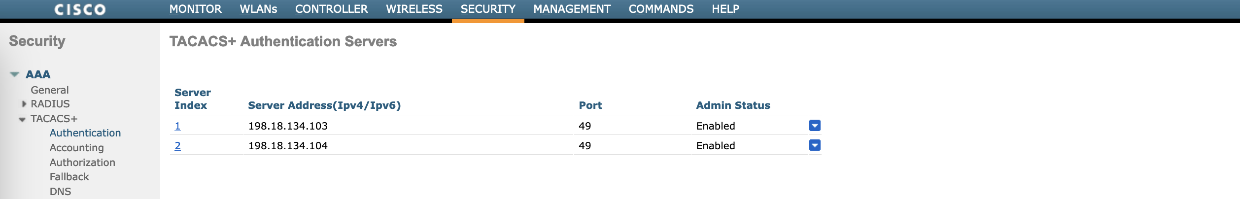 Next we configure the TACACS on WLC, on Security » AAA » TACACS+ » Authentication, add the ISE servers
