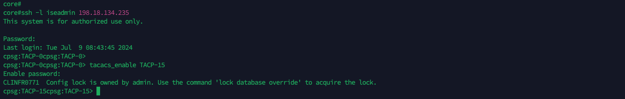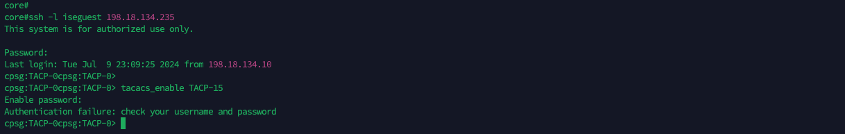 Now if we login with iseadmin, we’ll be given TACP-0 role by default, which we can escalate by clicking TACACS+ Enable