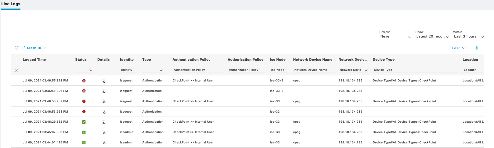 ISE Live Logs shows these users authenticating to ISE