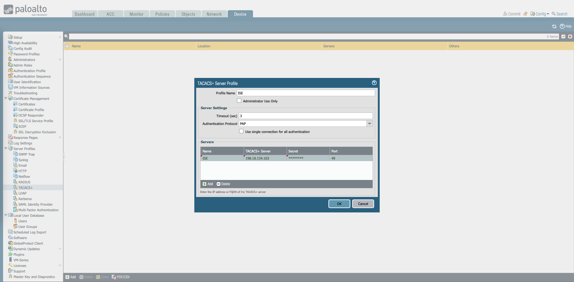 Then on Device » TACACS+, create a new profile containing the ISE servers