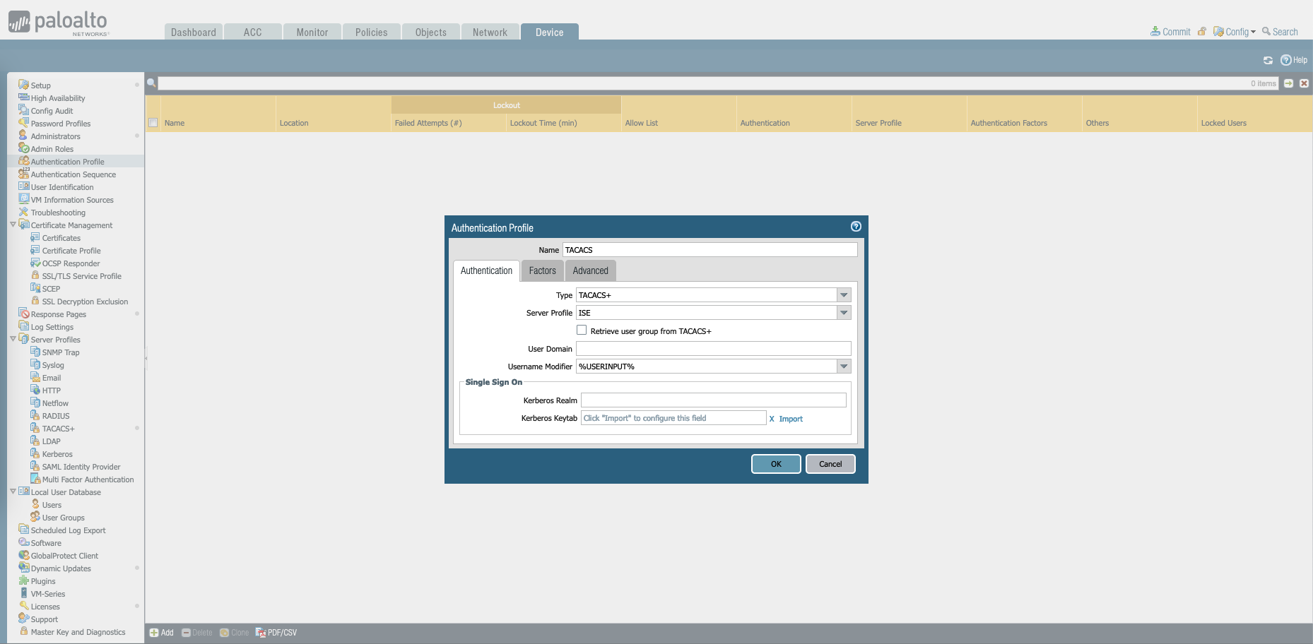 Then on Authentication Profile, create a new Profile with type of “TACACS+” and the Server Profile created just now