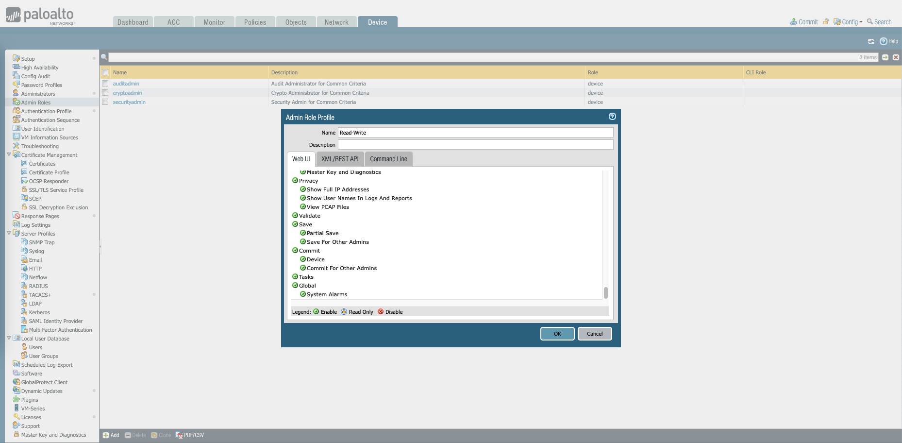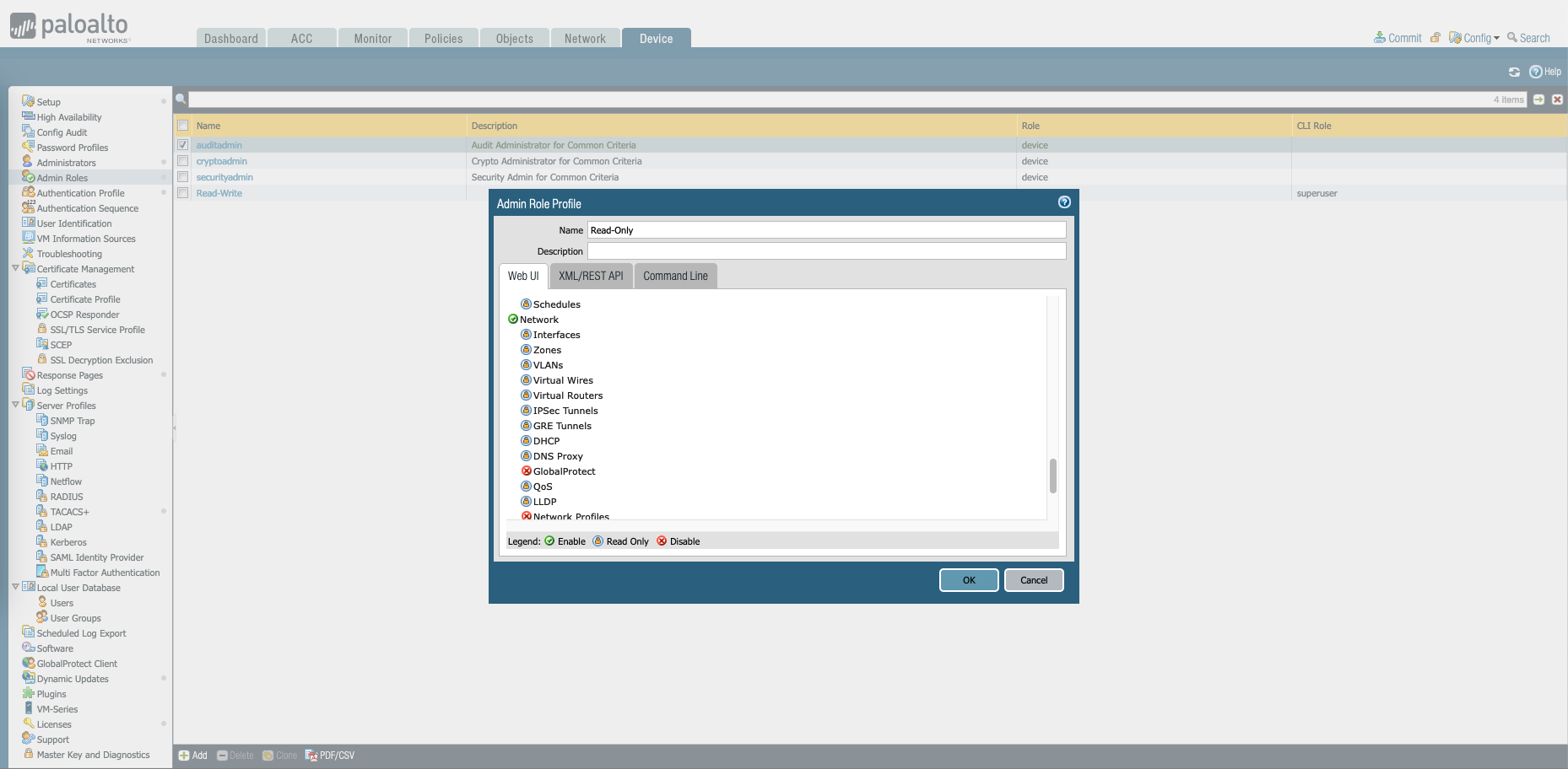 On the Palo Device, create two Admin Roles for Read-Write and Read-Only roles