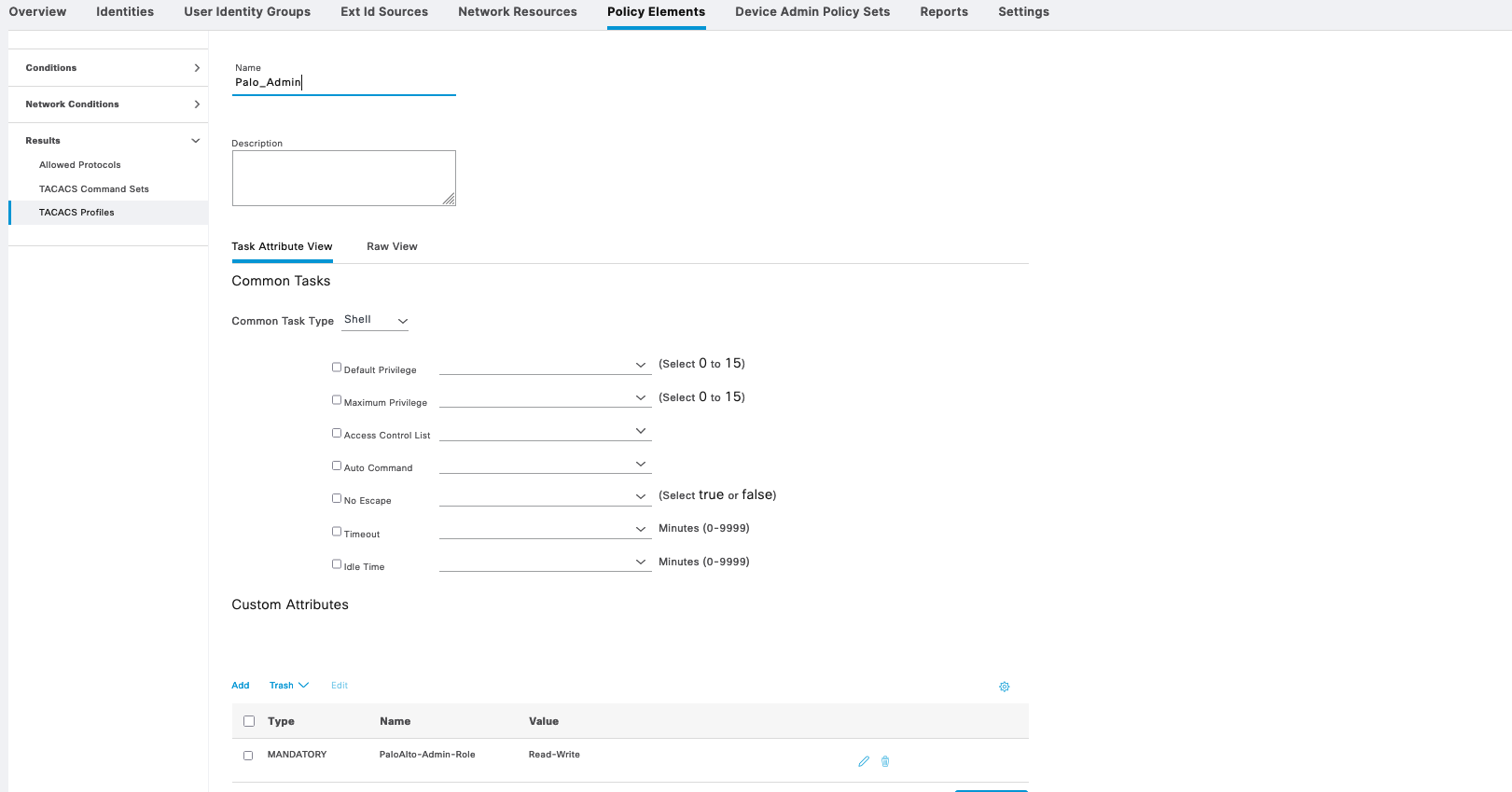 We also create 2 Tacacs Profiles with an attribute “PaloAlto-Admin-Role” and value of either “Read-Write” or “Read-Only”, following the value of created Admin Roles on Palo Alto