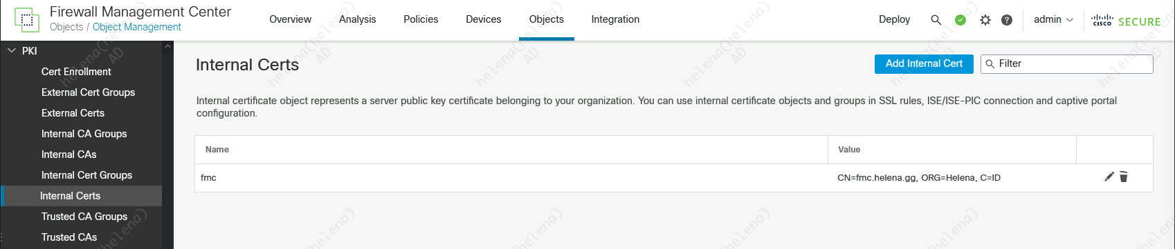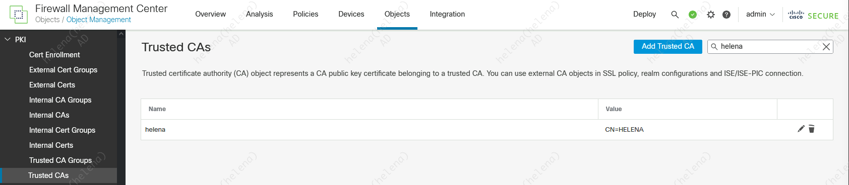 On FMC » Objects » PKI » Trusted CAs, import the Root-CA so we can trus the PxGrid certificate which was issued by thie CA