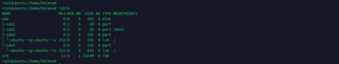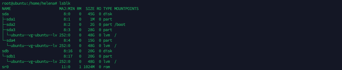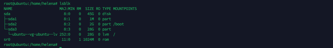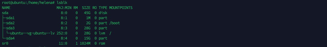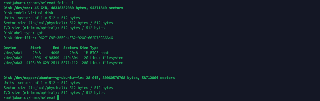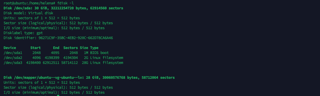 Here if we run “fdisk -l”, we can see that the physical disk /dev/sda has a 30 GiB virtual disk with a GPT partition table. It contains three partitions: /dev/sda1, a 1 MiB BIOS boot partition; /dev/sda2, a 2 GiB Linux filesystem partition; and /dev/sda3, a 28 GiB Linux filesystem partition. Additionally, there is a logical volume /dev/mapper/ubuntu–vg-ubuntu–lv of 28 GiB created using LVM, which utilizes the space from the third partition (/dev/sda3).