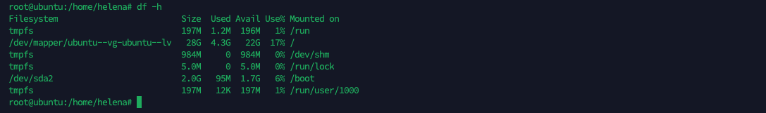- /dev/mapper/ubuntu–vg-ubuntu–lv: This is the main logical volume for the root filesystem (/). It has a total size of 28 GiB, with 4.3 GiB used, 22 GiB available, and a usage of 17%.