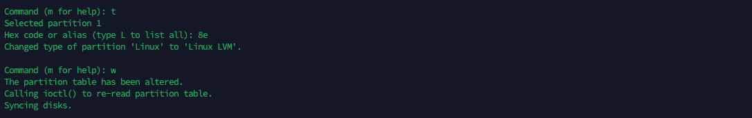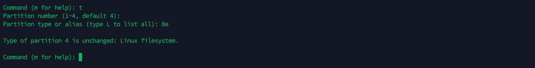 Next type “t” to change the partition type to “8e” which is a hexadecimal code representing Linux LVM (Logical Volume Manager) partition type.