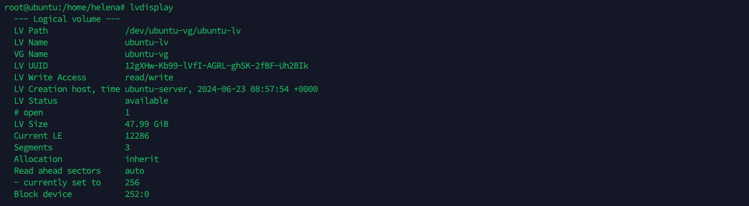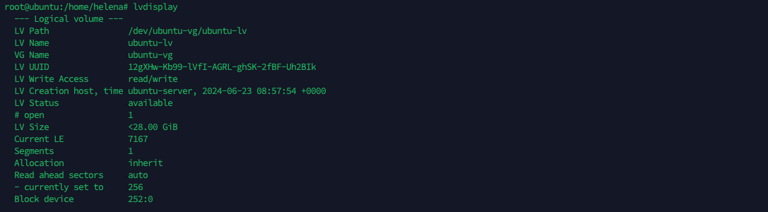 Here if we run “lvdisplay” to show the Logical Volume, we can see the LV “ubuntu-lv” has a size of 28GB and is a member of Volume Group “ubuntu-vg”
