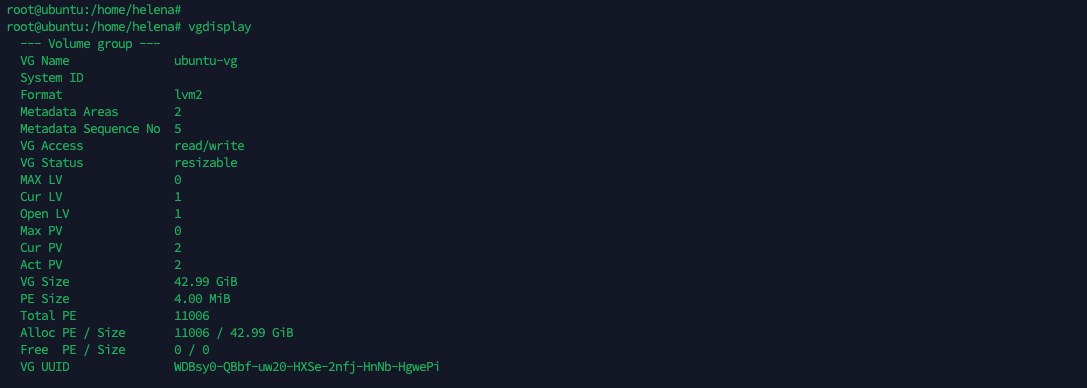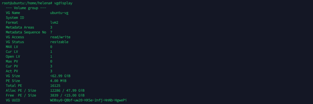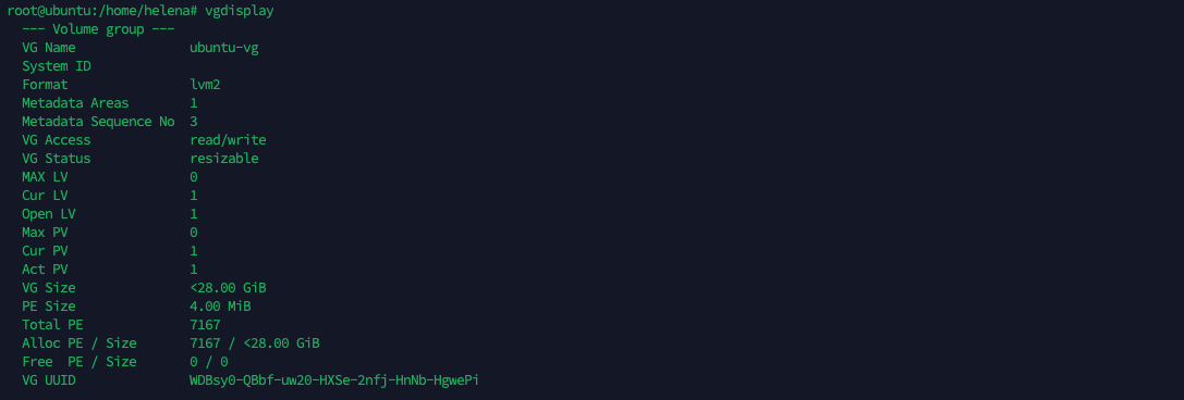 To see the Volume Group, run “vgdisplay”. Here we can see the VG “ubuntu-vg” with the size of 28GB and 0 free Physical Extend (PE) Size
