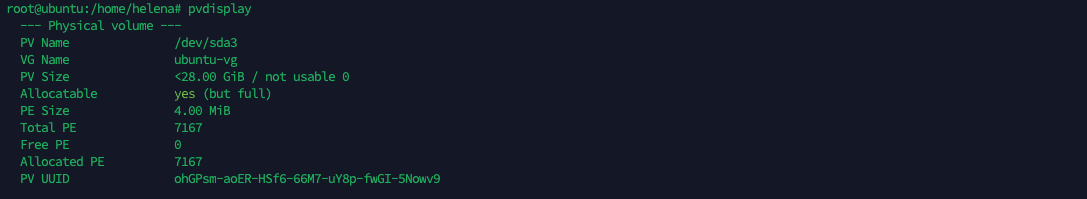 Next to see the Physical Volume, run “pvdisplay”. Here we can see this PV uses partition “dev/sda3” and being used by VG “ubuntu-vg” with the size of 28GB