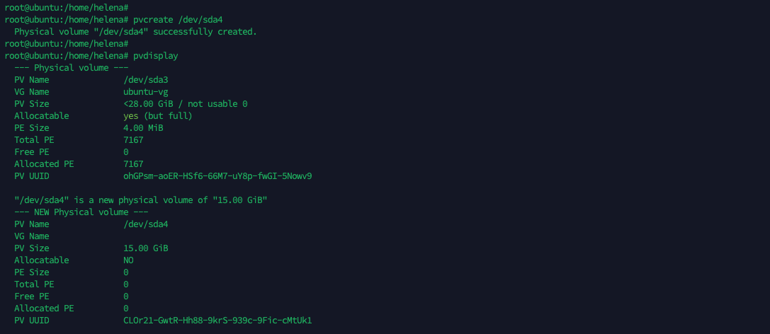 We have created a new partition “dev/sda4” earlier, lets use that to create a new PV with “pvcreate /dev/sda4”