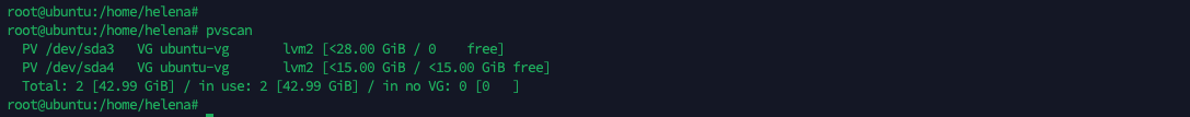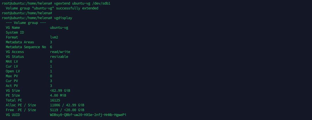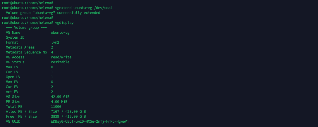 Next we extend the size of “ubuntu-vg” VG using the newly created PV, with the command “vgextend ubuntu-vg /dev/sda4”