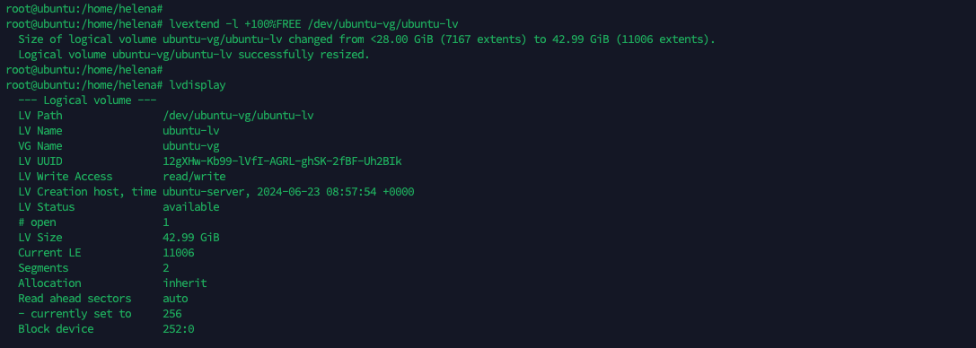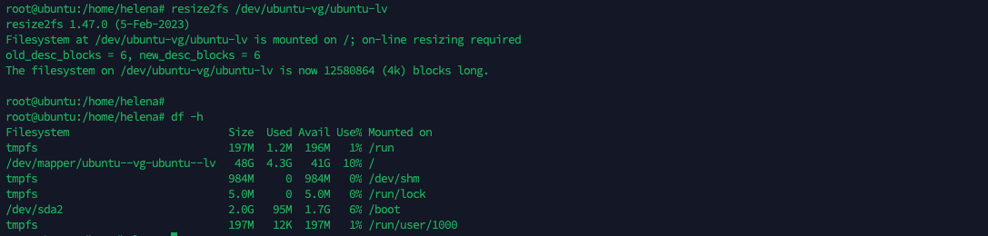 Lastly, we need to adjust the filesystem size to match the size of the underlying block device, to do that run “resize2fs /dev/ubuntu-vg/ubuntu-lv”