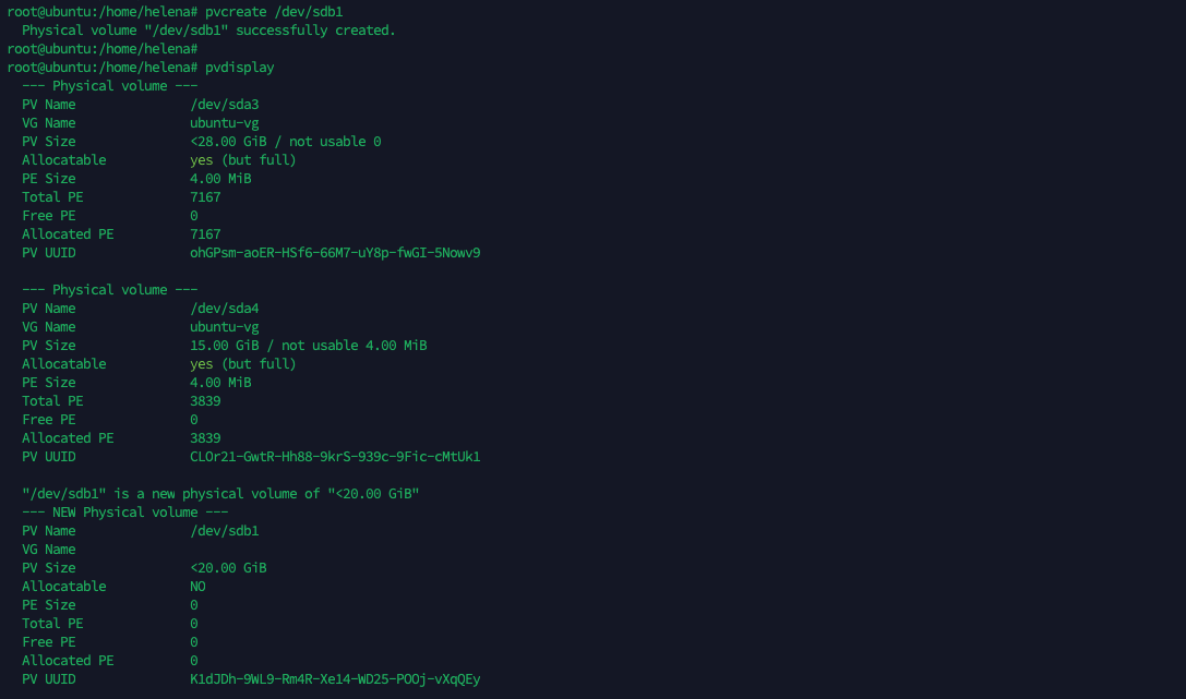 Next we create a new Physical Volume (PV) using thew newly created “dev/sdb1” partition