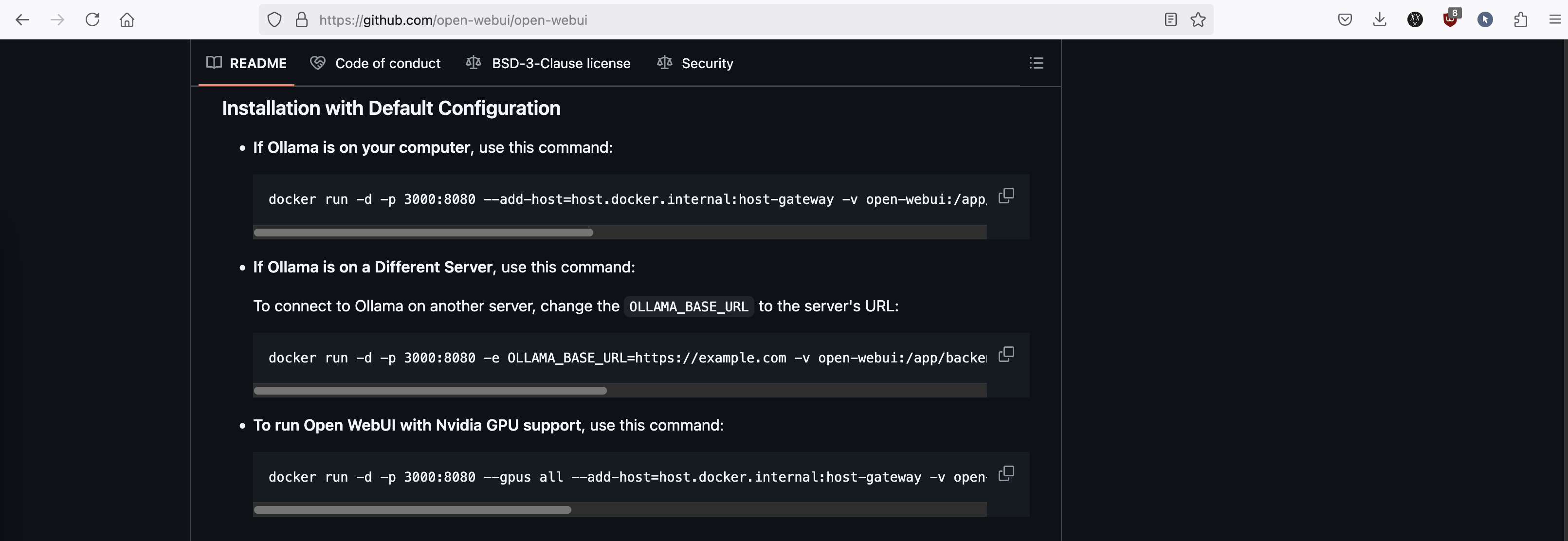 Then open the Open WebUI github page and copy the docker command to pull it onto the local machine