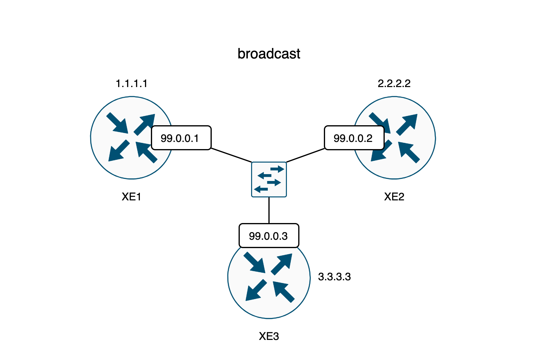 Here’s the configuration for broadcast connection between XE1, XE2 and XE3