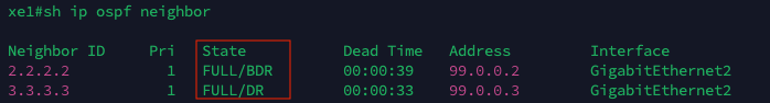 Here XE3 is elected as the DR because it has the highest router-id number, followed by XE2 as the BDR, while XE1 remains in DROTHER status.