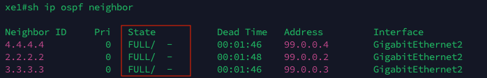 Checking the neighbor status, we see all the routers have been discovered, but what different from broadcast is there’s no DR/BDR election