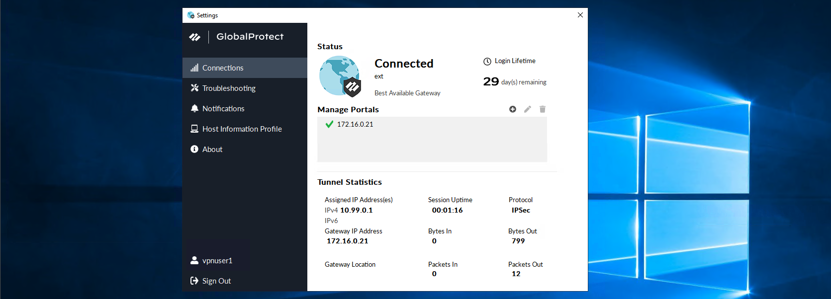 Here we have a working Global Protect SSL VPN using local users to log in